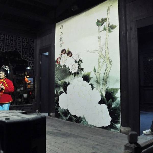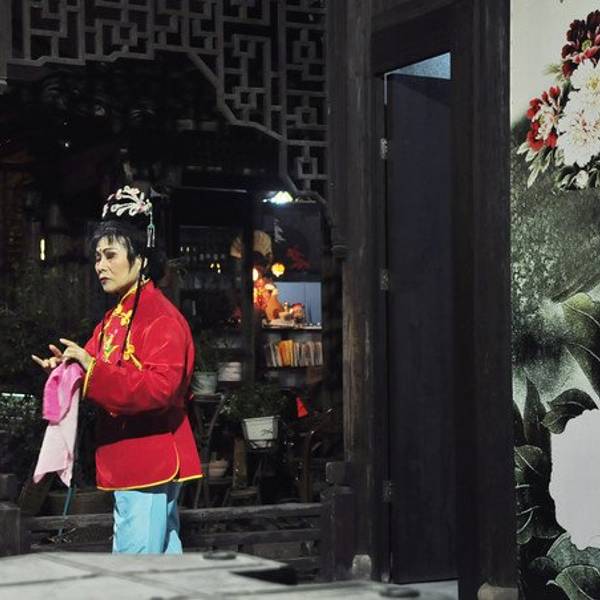 剧院附近特色商铺林立。国乐剧院后面可以看到翡翠湖国乐戏院是由从前古镇的戏台改造而成,舞台后面的“墙”不是固定的,墙外就是河,有机会拆掉“墙”就可以坐在船上看戏。
