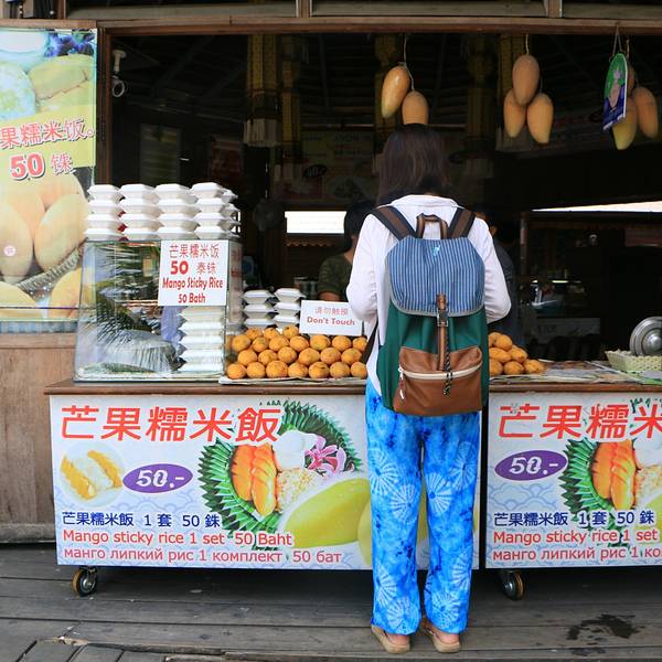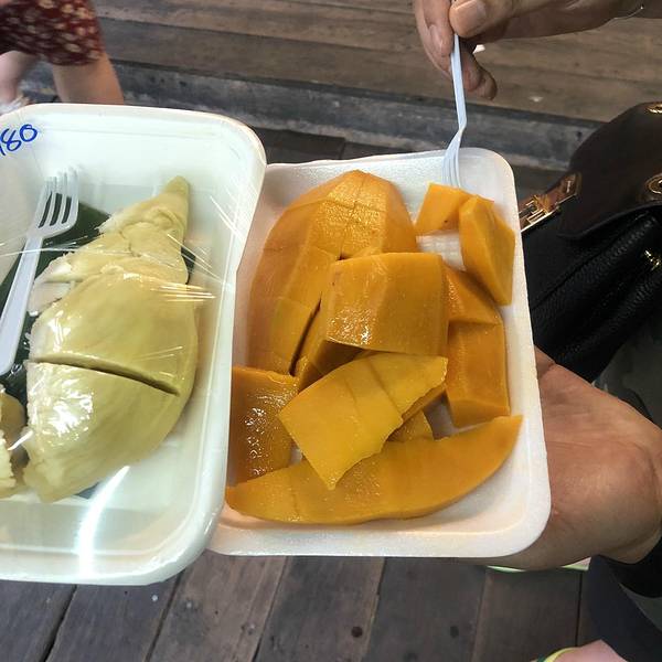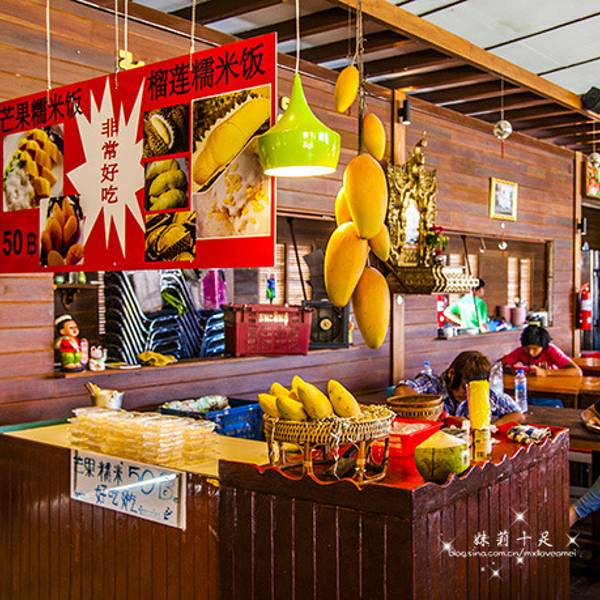 【附近餐饮住宿】附近没有住宿,建议出租车...【特色】我特别推荐芒果糯米饭,50泰铢特别大只的芒果又香又糯,好吃记了,买了两份,而且米饭也很特别,里面还有很多椰浆!而且水乡晚上,亮起了灯,很是漂亮的感觉。