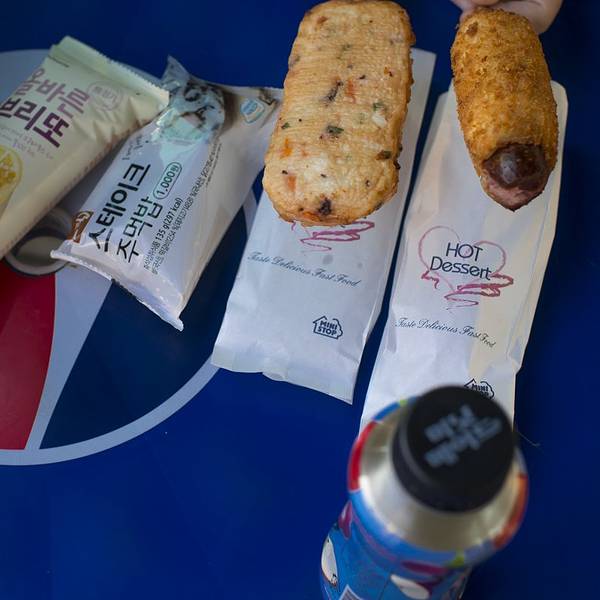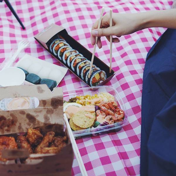公园门口很多人派外卖传单,可以从传单电话上点餐。可因为我不懂汉语,我们就到了附近的E-mart买了包饭、年糕、 沙拉 等。