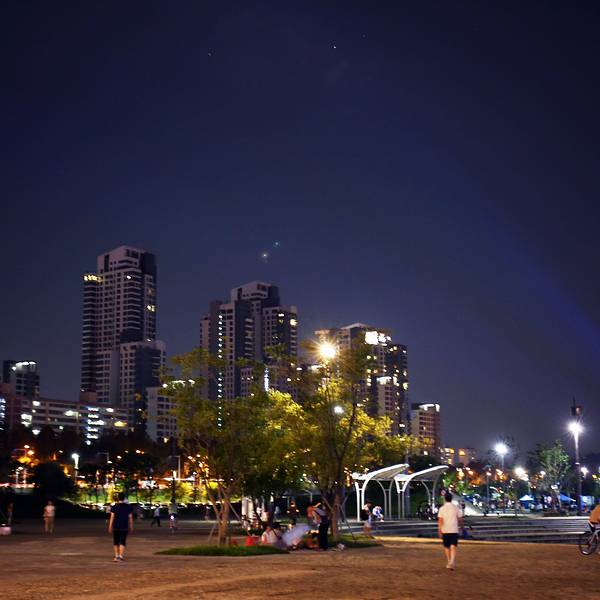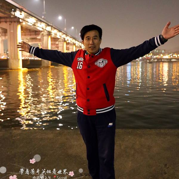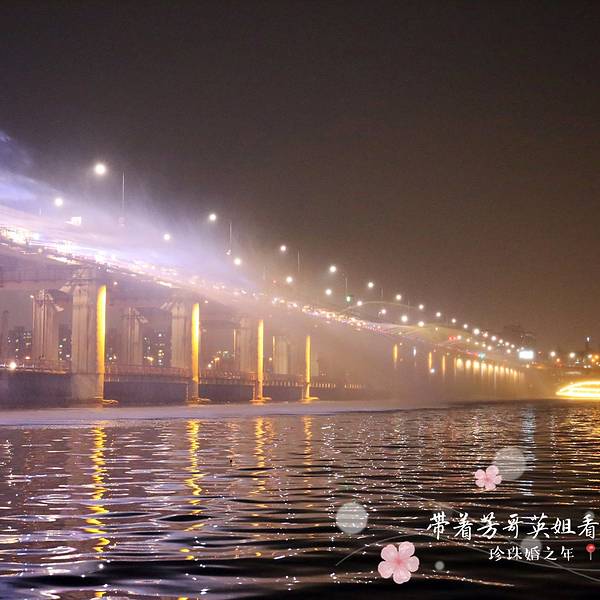 回到出发点,硬着头皮用我那半生超不熟的韩语问了保安大叔,大叔指了条道这才找到。嗯,怎么说呢,汉江公园是个散步跑步骑车约会的好地方。就是这个灯光喷泉并没有很壮观,水流细细的小小的,这图还是我拉了镜头拍出来的,不然看不太清还有在喷水,也可能是我观看的位置不对,在琢磨着也许道江对岸看的更好? 展开