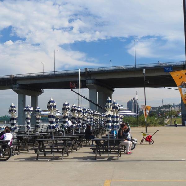 公园门口很多人派外卖传单,可以从传单电话上点餐。可因为我不懂汉语,我们就到了附近的E-mart买了包...汝矣岛汉江公园是 韩国 最受欢迎的野餐及露营圣地。
