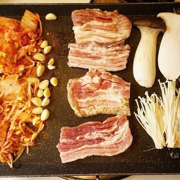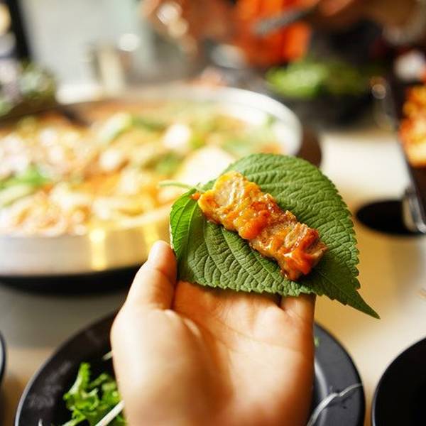 - ...上烤,然后吃的时候拿菜叶卷肉在卷进去烤的泡菜一起吃,味道真的很特别,这样吃起来就一点不会油腻了
