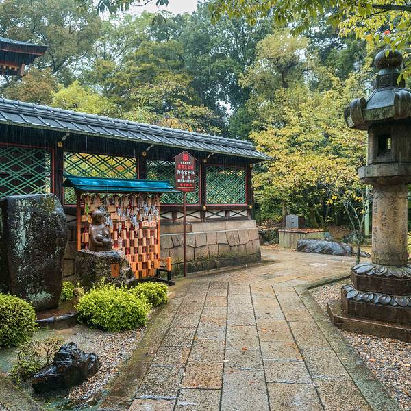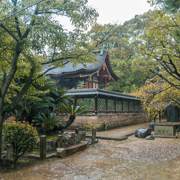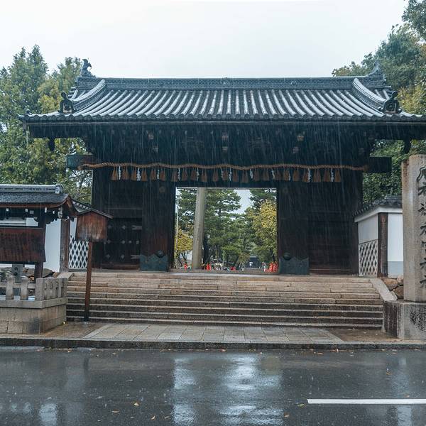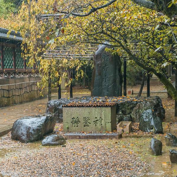 【交通方式】 乘坐京阪本线到“伏见桃山“站下,沿指示牌徒步10分钟即达。 或乘坐JR奈良线,在“桃山御陵前”下,徒步5分钟也可到达。御香宫神社是位于京都区伏见桃山的神社。俗称“御香宫”、“御幸宫”,这里供奉着日本第一安产守护的大神,是保佑顺产、育儿的神社。据说在日本怀孕5个月的时候,要在当月的戌日去神社祈祷母子平安。每年10月份都会在这里举行神幸祭。此处的涌水称作“御香水”,被日本选定为名水百选之一。我们去到的时候,雨一下子就大了起来,所以神社里面除了神职人员之外,基本没有游客或者前来参拜的人。躲在旁边的屋檐下,反而能够更加清楚地观察这间神社。它的建筑不像伏见稻荷大社那样通体朱红,鲜艳耀眼,绝大部分建筑都是用石头和木头修筑的,显得十分低调和古朴。主路两侧种植苍松,青石板路一层不染,很有禅意。
