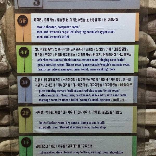 温泉有极冷和极热温泉,也有正常温度的温泉,一般先洗澡,后泡浴,2楼还能做按摩,美容。楼层指示这家汗蒸馆因为拍摄过热门韩剧《秘密花园》《巴黎恋人》,因此很受欢迎。一楼前台,先在前台领取自己的汗蒸服和钥匙,然后把鞋子存放在一层鞋柜里,鞋柜号码跟钥匙号码一致。然后光脚上到二楼,是洗浴区,男女分...这家汗蒸馆因为拍摄过热门韩剧《秘密花园》《巴黎恋人》,因此很受欢迎。一楼前台,先在前台领取自己的汗蒸服和钥匙,然后把鞋子存放在一层鞋柜里,鞋柜号码跟钥匙号码一致。然后光脚上到二楼,是洗浴区,男女分开。在2楼可以把自己的衣服存在衣柜里,然后先去洗浴区洗澡,然后泡温泉。温泉有极冷和极热温泉,也有正常温度的温泉,一般先洗澡,后泡浴,2楼还能做按摩,美容。之后换上汗蒸服,光脚上三楼。三楼是公共区,男女共用。这里有极热汗蒸房和极冷汗蒸房,还有餐厅、儿童娱乐区。在这里一定要尝尝米汁和温泉蛋。温泉蛋是2000韩币三个,有点类似五香卤蛋,还是挺好吃的。米汁的味道并不是所有人都喜欢,带一点点酒味的感觉,很大一杯,补充水分。四楼是健身房,还有各种美容按摩房,五楼可以睡觉,这里可以过夜,还有电脑房。劳累了一天,泡泡澡,蒸一蒸,很放松。 展开