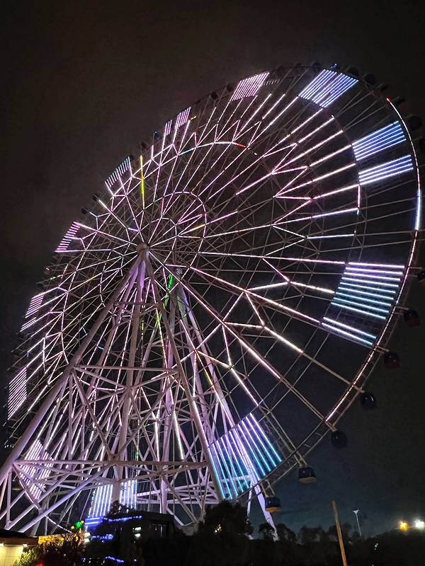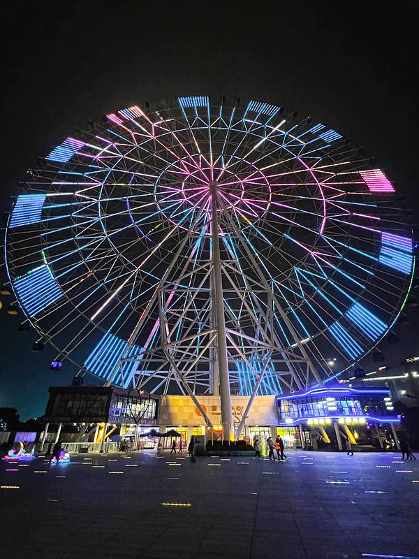 在乐园大门对面的路口,抬头就能看到南昌之星标志摩天轮,夜晚其轮面彩灯由无数LED照明构成,全部亮灯后显示一座巨型的彩色时钟,在夜空中不断闪烁。