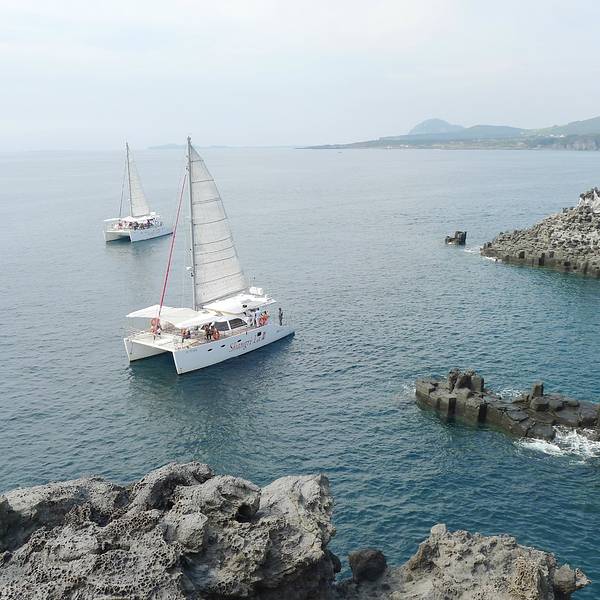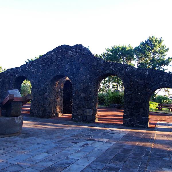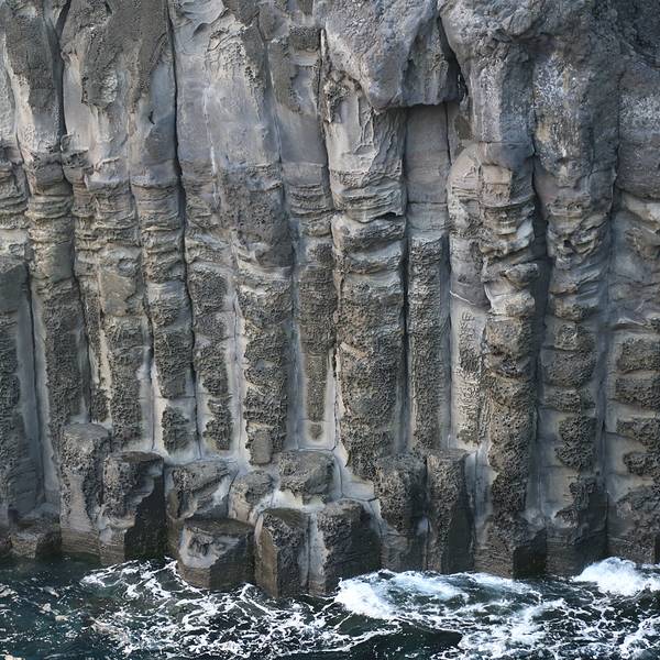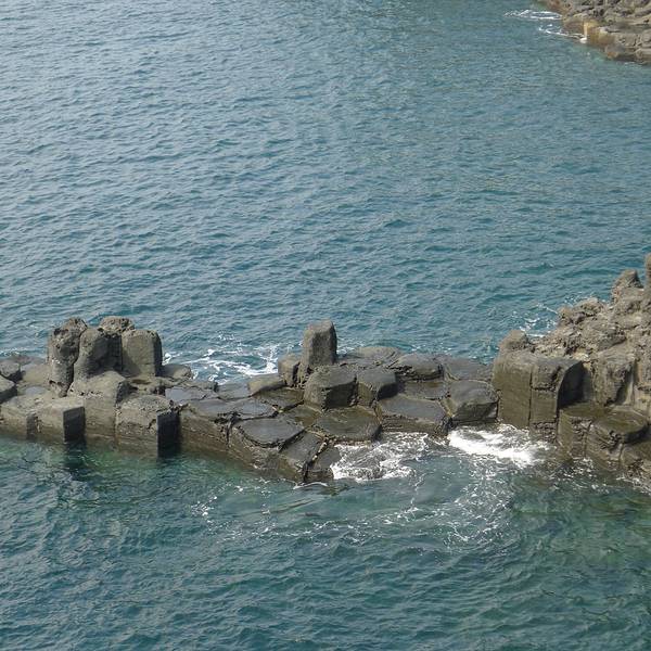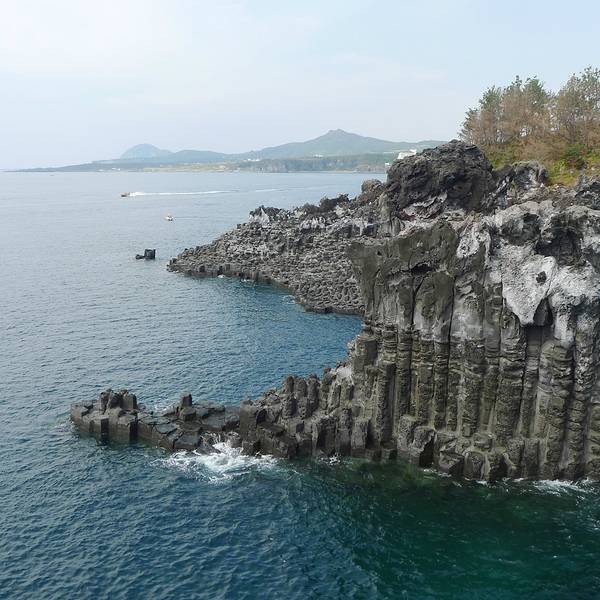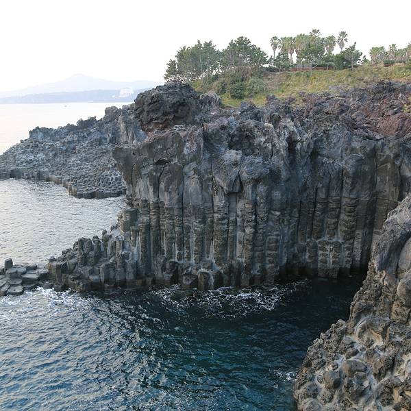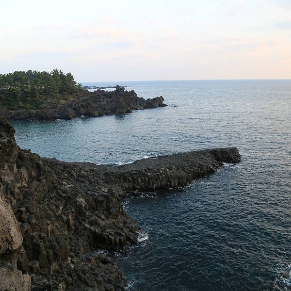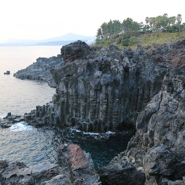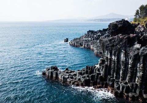位于济州岛西归浦市的中文洞到大浦洞之间的两公里的海岸上,有一条长达1000米的黑色石带,那就是济州岛闻名海内外的柱状节理带。山上岸边植物繁茂,翠柏苍松,景色十分迷人。 这条高达40米的呈多角形垂直的节理,较早出现于50万年前玄武岩质熔岩里垂直节理。是济州岛高峰汉拿山火山爆发时喷出的温度高于900度的岩浆,流入海中急速冷,发生瞬间收缩后而形成的。大自然其妙地造就了美丽的景色,令人惊叹不已。 柱状节理带位于一个公园内,入口就在中文国际会议旁边。进去之后先要走过一个小广场,广场上有几个小型雕塑,如巨大的海螺、一群海豚和一条帆船等,帆船雕塑上的指示牌标注着从这里去往包括上海在内的世界各有名城市的距离。游客可以在这里拍照留念。 再往下,沿着木栈道走到悬崖边,你就可以俯瞰伫立在海中的柱状节理带,清澈的海水拍打在排列整齐的石柱上,翻起阵阵白色的浪花,你不得不感慨大自然的鬼斧神工。当波浪汹涌时这里的浪可以击打近20米高的悬崖,真是惊涛拍岸,蔚为壮观。