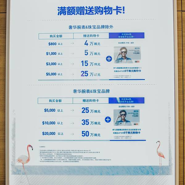 首尔店:5000韩元交通卡(消费一美金即可)+4日WiFi使用券(满300美金)+N 首尔塔门票/自拍棒(满500美金)+爱宝乐园通票/随身充电宝(满800美金)+3万至30万韩元不等的购物卡(满1000-10000美金)。