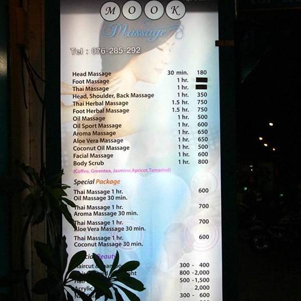 凌晨3点的飞机,正愁怎样打发时间,路遇一家马杀鸡店,浏览价目单时,从里面出来一个女老外,看见我们直呼这家“very good!very gooooood...” (店名:MOOK)点了两人的腿部+全身泰式按摩,1个半小时共900B...这家的手法真如老外所说“very good”,非常正宗,店内环境也还不错...想起昂贵的柚木宫SPA,顿时有种被“烧”的感觉...