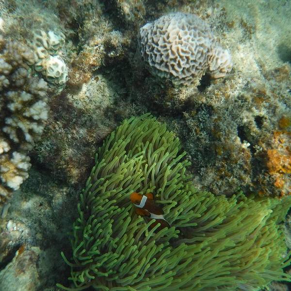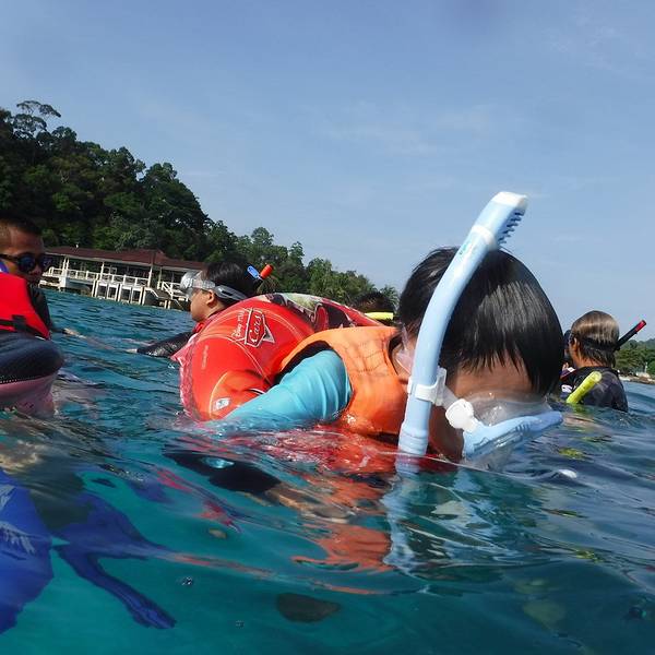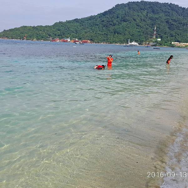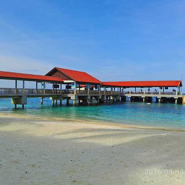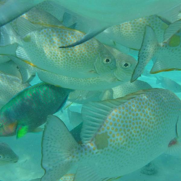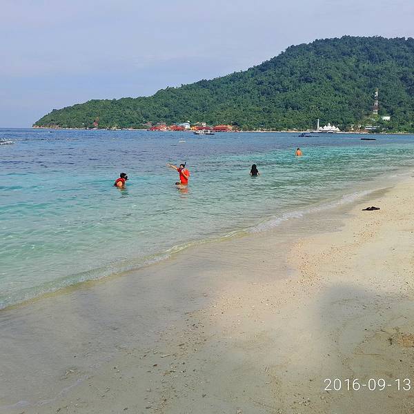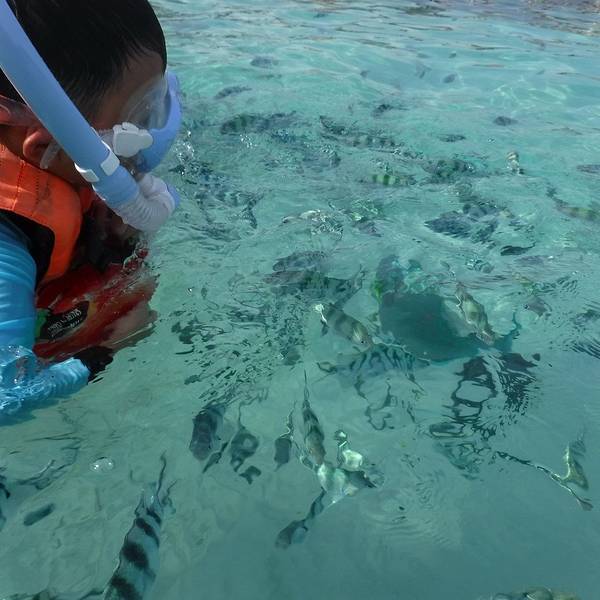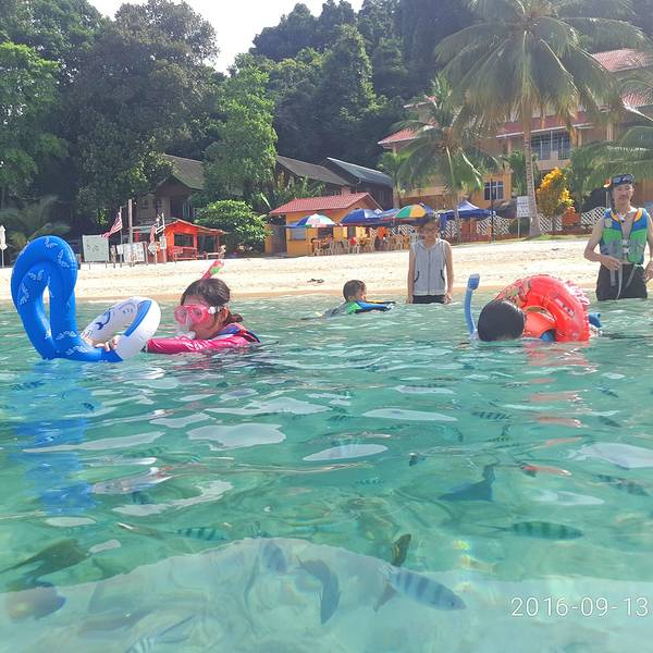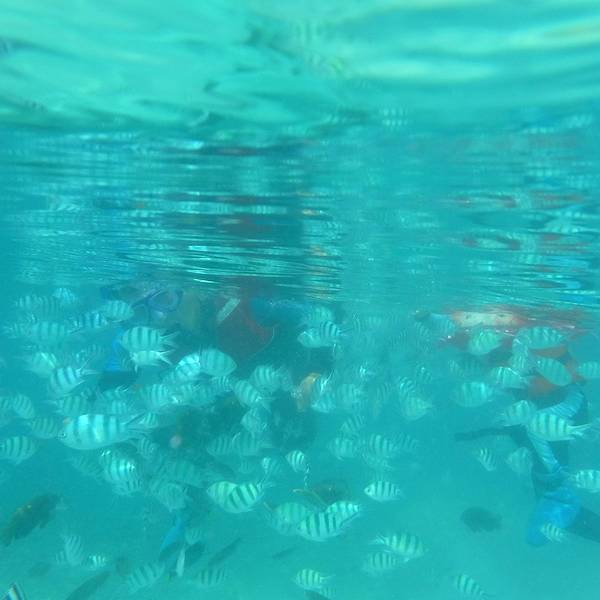 在浪中岛的第一个早上,本打算参加看日出活动,早早起床,到了酒店大堂才发现,当天日出活动因为天气原因取消了,只好继续回去睡觉咯。 七点多起床吃完早餐,回房换好衣服拿好行李,就去大树下等,8:30左右出发坐快艇参加停泊岛的浮潜活动。记得带点现金,上岛可以消费。 半小时左右就到了大停泊岛外海,大家纷纷跳下水。