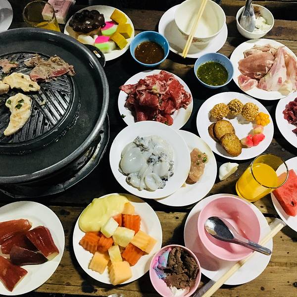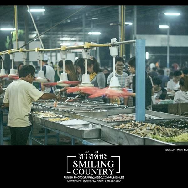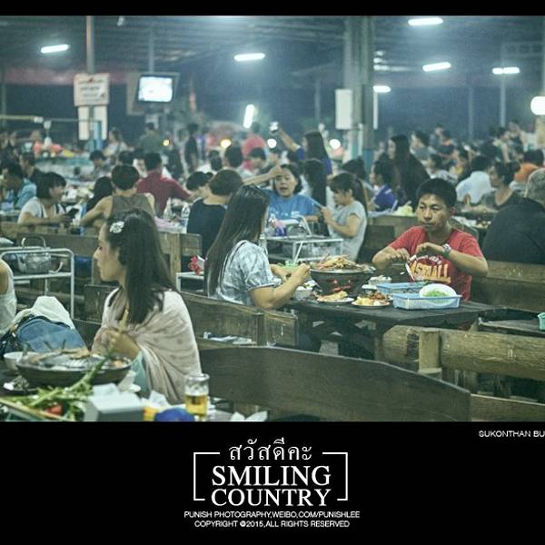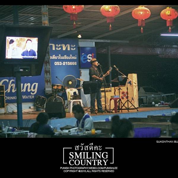 胃里还没消化完,我们就等不了来到【千人火锅】准备开战。 地址:46/1 ถนนห้วยแก้ว ต.ช้างเผือก อ.เมือง จ.เชียงใหม่ 46/1 Huay Kaew Road, T. Chang Puek A.Muang Chiangmai 如果自行前往,先到清迈城墙外西北方向的Huai Kaew路,看到Central Shopping Mall 后, 向前(往清迈大学方向)再走一段,在你左边看到一家“大華銀行”(汉字)后,银行对面的巷口有一 黄色灯布广告的招牌,上面一串的泰文,认定中间“1000”就是了,顺着这条巷子走进去就可以到达~ 如果乘车:给司机或者当地人出示这个泰语名字 สุคนธา หมูกะทะ,或者告诉司机Sukonthan MOO-GA-TA就行~千人火锅的Tips: 1⃣️营业时间:17:00-24:00。但也不要来的太晚,食物不会太新鲜。 2⃣️费用:209B/人,但独自一人的话则230B/人,因为你要自己一个人占一张大桌。 3⃣️不能浪费食物,如果浪费,按30B/克或300B/千克收取罚金。 4⃣️饮料,矿泉水,苏打水免费,但啤酒,要单独花钱。 5⃣️先食用,后结账,结账时原位招呼红衣服务员就行。千人火锅总体感觉还不错,值得来这里感受它的气氛,在几百米长的餐桌上跟外国人挤在一起拿食材,享受动手烤肉配酱料,最满足的是可以免费吃很多种水果!!“小城故事多,充满喜和乐,若是你到小城来,收获特别多。” 千人火锅,当地歌手在台上用情得唱着邓丽君的歌,我们在饭桌前拍着双手轻声跟着和。在邓丽君生前最喜欢的城市听着她熟悉的《小城故事》,总会有别样的感受。