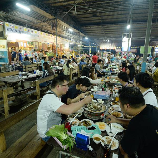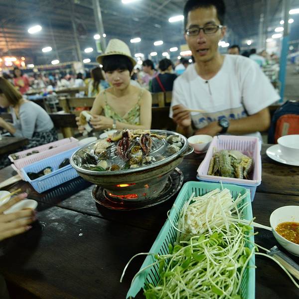 据说能容纳一千人的火锅店,6点多就已经坐满了人,可见火爆程度。千人火锅果然名不虚传,海鲜多,品种多,还有熟食,饮料,味道都很不错。★如何去:之前有些游记提到千人火锅很难找,我觉得不难找。打双条车告诉司机去千人火锅,如果司机不愿意开进去也没关系,因为进去的路就用中文大大地写着“千人火锅”,然后走不到200米就到了。★味道如何:个人觉得味道很不错,不加调料已经觉得很鲜美啦,再加上泰国特色的酱料,味道就更好了。(酱料都是免费拿的)★价格如何:四五十块一位,个人认为性价比非常高,因为海鲜的种类非常多,数量也多。★建议时间:建议6点半前前往,我们6点到,已经很多人啦,不过还是有位置的,晚点就可能要等位了哦。