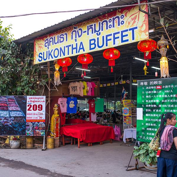 从素贴山下来,再去清迈大学逛了一圈,在回古城的路上,我们发现了传说中的千人火锅。千人火锅就是泰式炭烧火锅,千人火锅因为国人的叫法而出名,因此在老远的地方就能看见它的大招牌,而实际上从大路要拐进小巷...