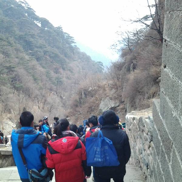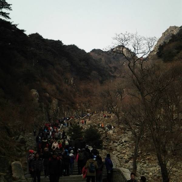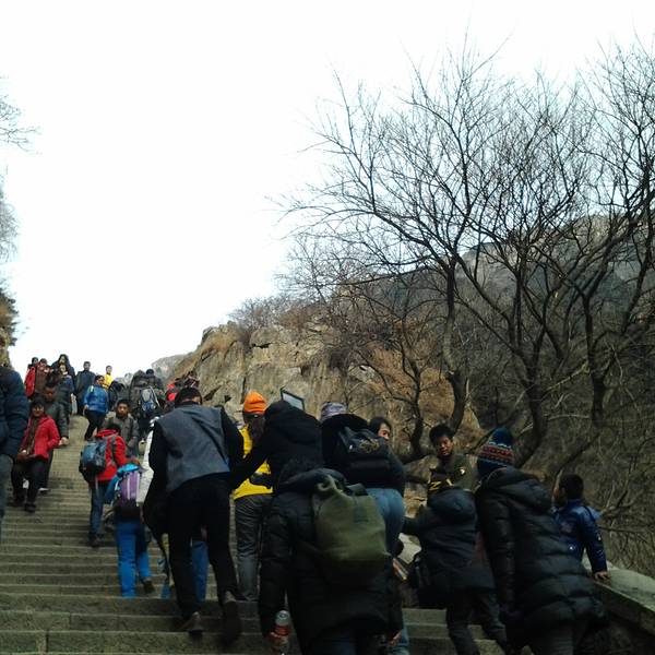 3、关于夜爬。由于有爬山的经验,小伙伴便跟随着我12点上山。这里温馨提醒一下,最好是下午的时候到达泰安,然后找一个宾馆先睡上几个小时,这样的话不会太累。然后登山夜怕要注意打电筒,注意石阶,有好几次差点踩空。在十八盘那会人就会多起来,建议扶好扶手,把重心放低,尽管山路陡峭,加上长时间没运动,腿疼,但是我们都坚持了下来!
