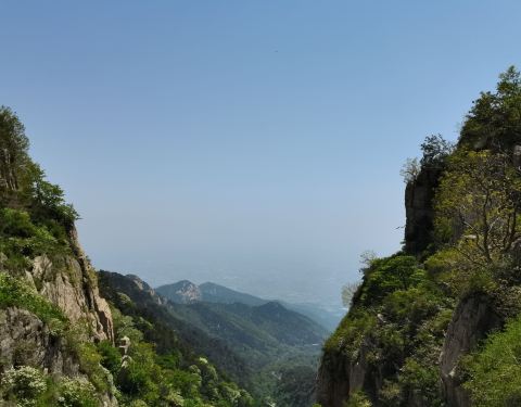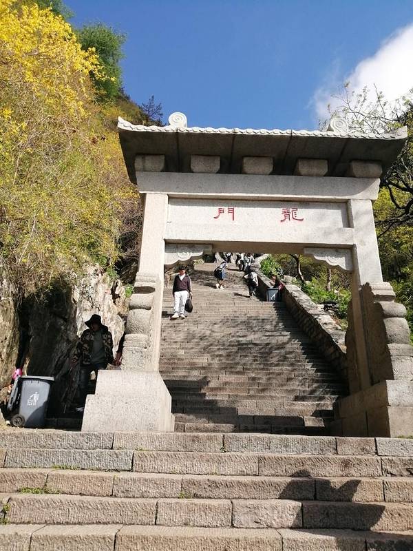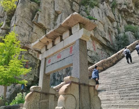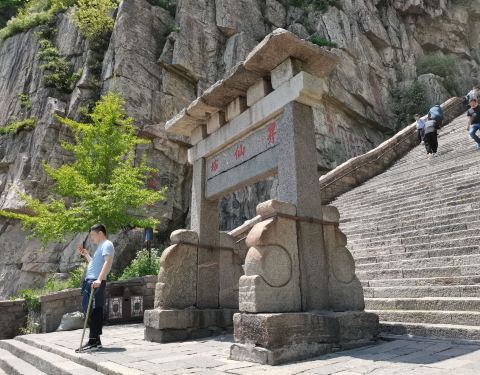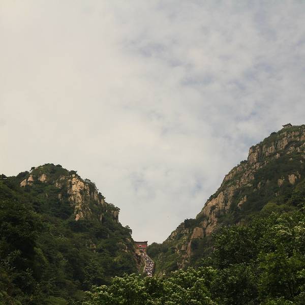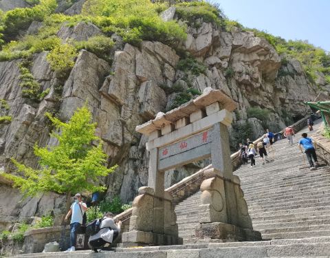 我选择的是天外村乘坐到中天门后,经过十八盘到达南天门,一路上都有众多名人古迹,历代刻石2500飞余处,飞瀑直下,古树众多,植被丰富,树木郁郁葱葱泰山的地貌很有特色,由低而高,造成层峦叠峰、凌空高耸的巍峨之势。一路走一路慢慢看,花费了四个小时到达南天门。