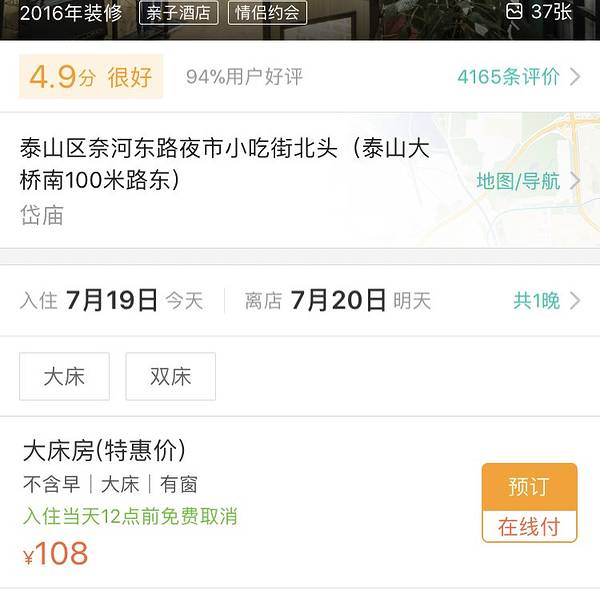 预订了紫气东来客栈,对比了很多家,觉得这家性价比最高,位置就在红门登山口旁边11点半从济宁坐车,14点50分到泰山站,准备订个房间放行李,休息,养足精力晚上爬山。预订了紫气东来客栈,对比了很多家,觉得这家性价比最高,位置就在红门登山口旁边。老板人也不错,由于封路滴滴司机不知道路...11点半从济宁坐车,14点50分到泰山站,准备订个房间放行李,休息,养足精力晚上爬山。预订了紫气东来客栈,对比了很多家,觉得这家性价比最高,位置就在红门登山口旁边。老板人也不错,由于封路滴滴司机不知道路,提前下来了,打电话问路,结果老板骑着小电驴来接我了,赞一个。晚上9点半正式出发,路人很多,超出我的预期,还以为周一人不多,后来想到是暑假,看着也是很多学生党从登山口进入,走大概十五分钟到达红门宫,这算是提前预热,在红门宫这里买票验票进山,记得带身份证,扫二维码买票,刷身份证进入,不需要取票,不是黄金假期不需要提前买票。打火机不能带进山,安检会查。 展开