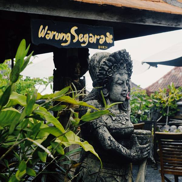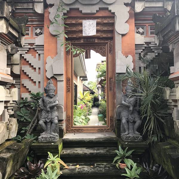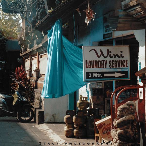 乌布市场的确热闹非凡,印尼古式建筑交错其间,每一栋都建的很有韵味。市场内很大,由一条条相似又各有特色的街巷组成。街边有各色店铺,音乐酒吧更是不在少数。人行道很窄,路上往往人头攒动。我们的住处在一条深巷的拐角处,闹中取静,安逸得很。店主更是潇洒,何时付款、如何登记,全都由房客自己决定。▲工艺品店里摆着各色纪念品。▲别了一朵鸡蛋花。▲旅馆内写有我 check-in 信息的小黑板。( Yuxi!)▲旅馆门外的小巷。我很喜欢这个洗衣店的小招牌。▲乌布街头几乎随处可见涂鸦。
