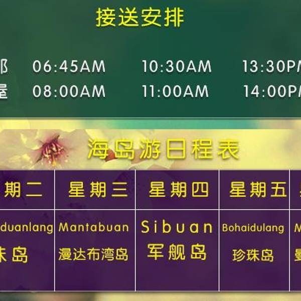 3、对于来度假的:每天免费提供不同的海岛游,休闲度假+跳岛游两不误