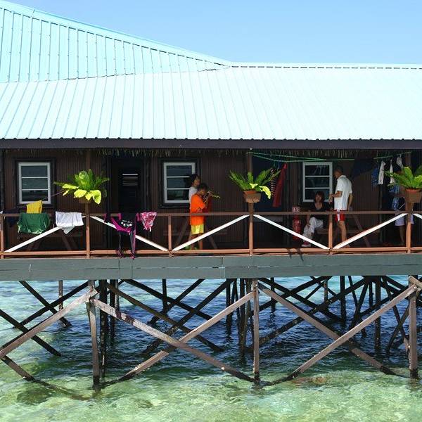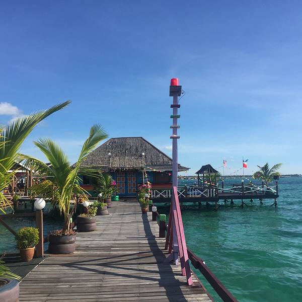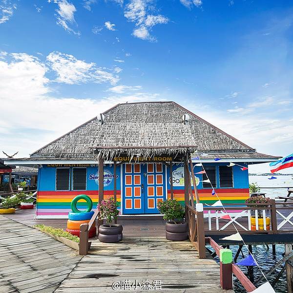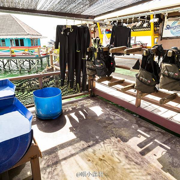 这儿就是彩虹屋的内部啦,潜水装备非常齐全,而且很整洁。绕场一周来个度假村大特写新佳马达在仙本那码头附近有办公室,我们稍作等候就有人来接我们去酒店,中午10点半的班船,10几分钟的船程就到了度假村,毋庸置疑,倘为了纯度假,一定是没有卡帕莱或者邦邦岛的视觉感受更好,毕竟人家离陆地更...新佳马达在仙本那码头附近有办公室,我们稍作等候就有人来接我们去酒店,中午10点半的班船,10几分钟的船程就到了度假村,毋庸置疑,倘为了纯度假,一定是没有卡帕莱或者邦邦岛的视觉感受更好,毕竟人家离陆地更远,海水更蓝,但就冲着只用他们一半不到的房价,就能住水上屋,还有免费的每日海岛浮潜,新佳马达绝对是首选。