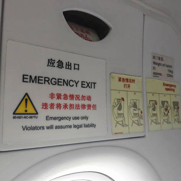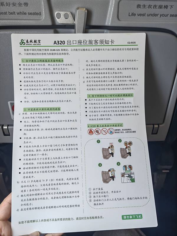 12:05分到达机场,中间停过两次上过客,后就上高速了,坐的也很舒服,下次有机会再来坐飞机就比较清楚了。直接下车,师傅帮忙把我行李拿出来,让我几号楼进去安检都说的很清楚。电梯直接进去办理托运行李,就喝着酸奶找吃的啦,起飞时间还早不着急去登机口。刚老板送我出来在店门口买了两杯扬大酸奶,现在要赶紧喝点,要不然液体带不上飞机。又点了份德克士汉堡,吃饱了,就可以安检通关了。值机时有要求坐靠近窗户的位置紧急出口操作手册与注意事项工作人员帮忙安排了紧急出口的位置,这个位置不能坐老人与小孩,而且位置脚放的地方空间比较大点,春秋航空的飞机都是廉价航空,座位都很拥挤。安排这个位置太方便了,但是空姐会不停的过来告知一些紧急事故我们需要做的事情,还有要保护这个紧急出口开关,不能被人来强行打开。起飞前说两遍,要降落时也来说两遍。看到这个蓝天实在是心情舒畅,扬州下雨两天都快冷死了,阴沉沉的。