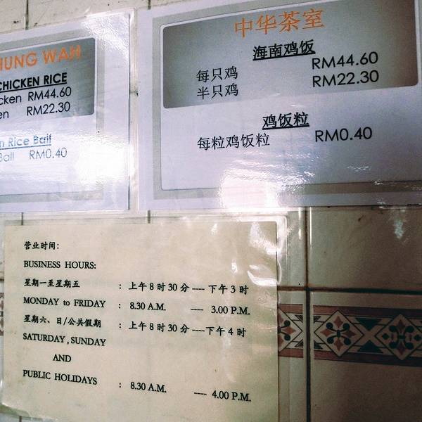 记得一件事:农历新年休假10天有一年农历新年想要吃中华海南鸡饭,竟然扑空。他休息了10天,竟然放弃了赚钱黄金时刻?来到了马六甲,如果你想要吃中华海南鸡饭的话,建议你先派一个人去排队,尤其是家里有老人家...记得一件事:农历新年休假10天有一年农历新年想要吃中华海南鸡饭,竟然扑空。他休息了10天,竟然放弃了赚钱黄金时刻?来到了马六甲,如果你想要吃中华海南鸡饭的话,建议你先派一个人去排队,尤其是家里有老人家的家庭游,年轻人去排队,老人家可以在对面的三叔公逛买手信。吃海南鸡饭肯定少不了吃蒜米辣椒酱,中华的蒜米辣椒酱很辣,如果你不能吃辣,最好不要动。饮料方面只有凉茶选择而已,而且他们采用马六甲椰糖来熬煮。