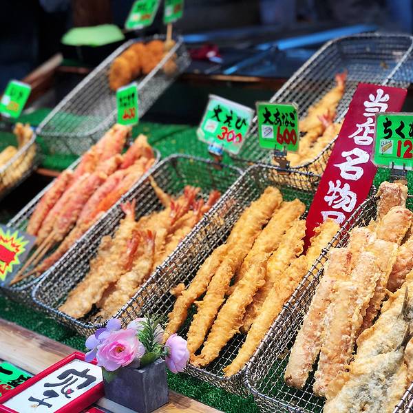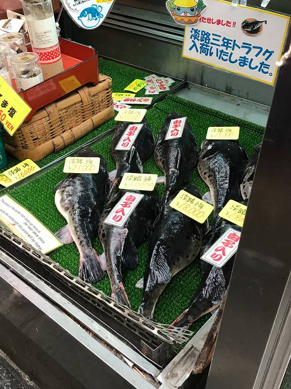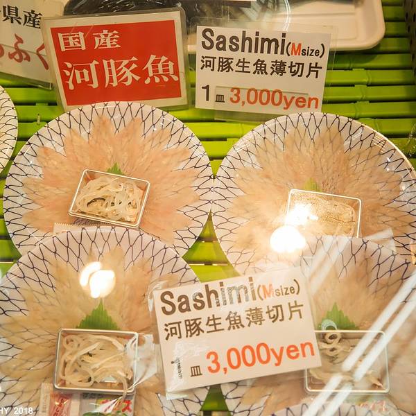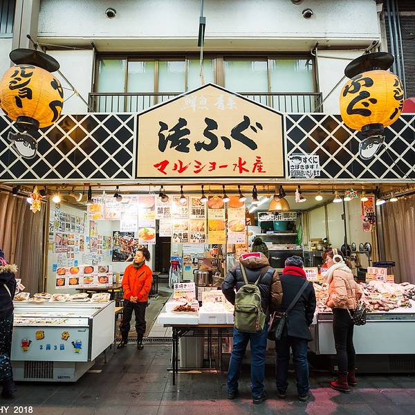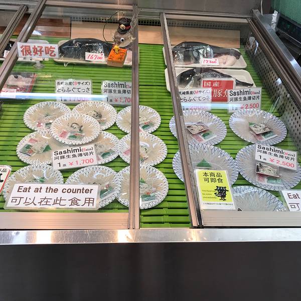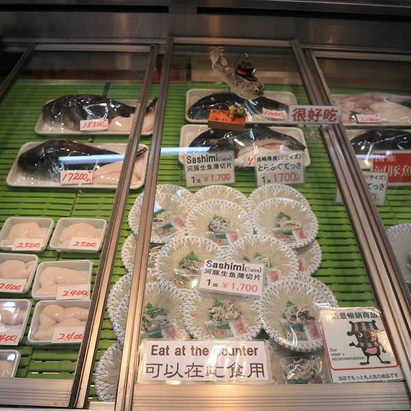 要注意,黑门市场的营业时间是上午9点-下午4点左右,但其实到了下午2点多,很多商铺就陆续关门了,你就会错过很多美食,所以首选上午时分过去。黑门市场非常大,一条600多米的路一直贯穿其中,期间还有横向的道路延伸,边吃边走,稍不留神就很容易迷失方向的。超市,大排档,餐馆开满了整条街道,不要一进去看到好吃的就买,后面还多着呢!!炭烧鳗鱼,爆炒猪内脏都是我比较喜欢吃的,毕竟都是香口的东西,吃着很得劲,而且价格也算合理。这里的海鲜个头都比较大,可以按照你喜欢的品种挑选,都有明码标价,也可以买一些他们已经搭配好的海鲜杂锦,每样东西都尝一点,反正品种繁多,每家店的价格都有所不同,自己要对比一下新鲜度和价格去购买了。比较常见的吃法就是烤着来吃,然后沾点酱油芥末,保持海鲜的鲜味的同时也有嘴上的刺激。除了熟食,日本人最喜欢的吃法当然是刺身,而我最大胆的尝试莫过于这道河豚刺身了。都说河豚的肉是剧毒的,如果处理不好吃下去,分分钟会中毒。不过在日本,因为吃刺身已经有相当长的历史,他们做河豚刺身的技术也已经相当的成熟,开门做生意这么久了,大可放心了。
