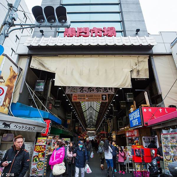 前文提到的日本三大食堂,来到大阪,自然要来黑门市场。食材和锦市场没什么差别,但是门脸儿的风格就很大阪,色彩要鲜明很多。