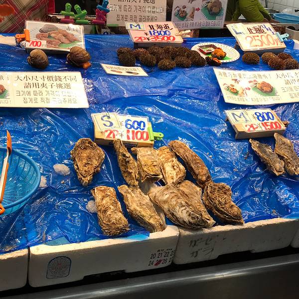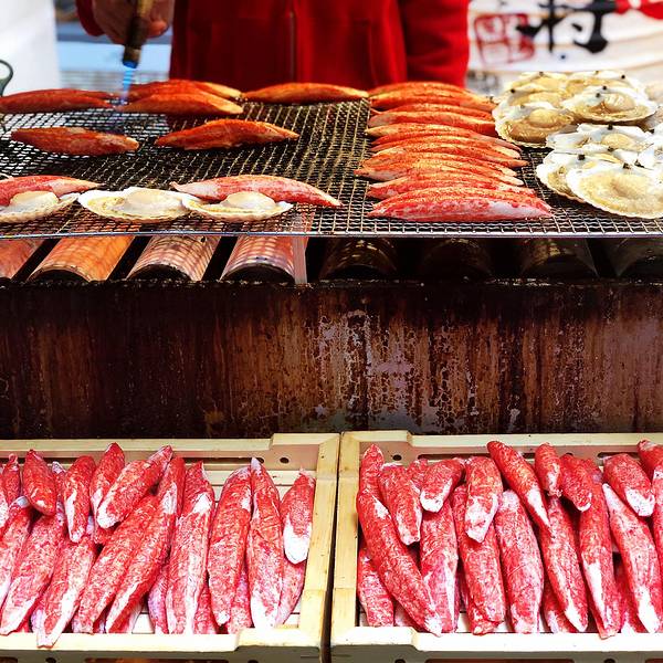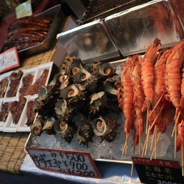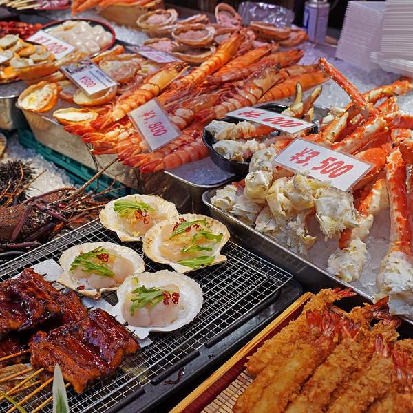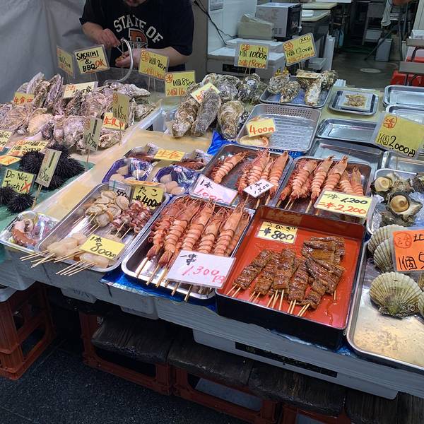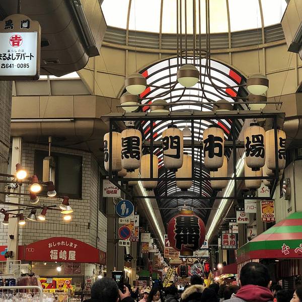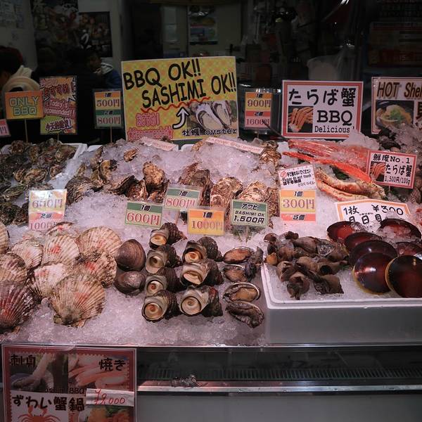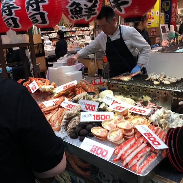 离开了大阪城公园,我们坐地下铁在「日本橋駅」出来,步行一小段路就来到了黑门市场,这里是大阪非常有名的菜市场,毕竟这里的新鲜水果,蔬菜,海鲜应有尽有,还有很多我几乎都叫不出名字来的海产品。刚好差不多...离开了大阪城公园,我们坐地下铁在「日本橋駅」出来,步行一小段路就来到了黑门市场,这里是大阪非常有名的菜市场,毕竟这里的新鲜水果,蔬菜,海鲜应有尽有,还有很多我几乎都叫不出名字来的海产品。刚好差不多到饭点,我们就打算在这里大吃一顿了。