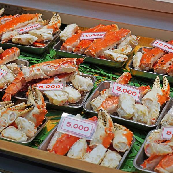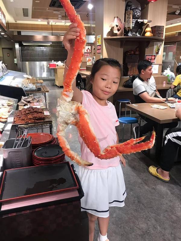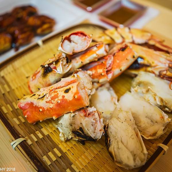 河豚肉已经处理好切好片,一份份包装好放在冰柜里,按大小了分,小份的也要3000日元一碟。河豚肉和皮是分开的,老板会小心翼翼地给你拆开,倒上一小碟酱油芥末给你。第一次吃起来,就单纯感觉到鱼肉比较有韧性,很爽脆,有海鲜的鲜味,其他并没有太多的感觉。可能也是因为它的处理难度大,所以才卖那么贵吧。一份河豚肉只能算是一道前菜,后来我们还陆续吃了这种烤长脚蟹,大虾,扇贝等等等。。。这里真的可以算得上是走进去,扶着出来的一个美食天堂了,所以推荐空腹去噢!!