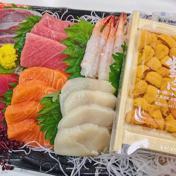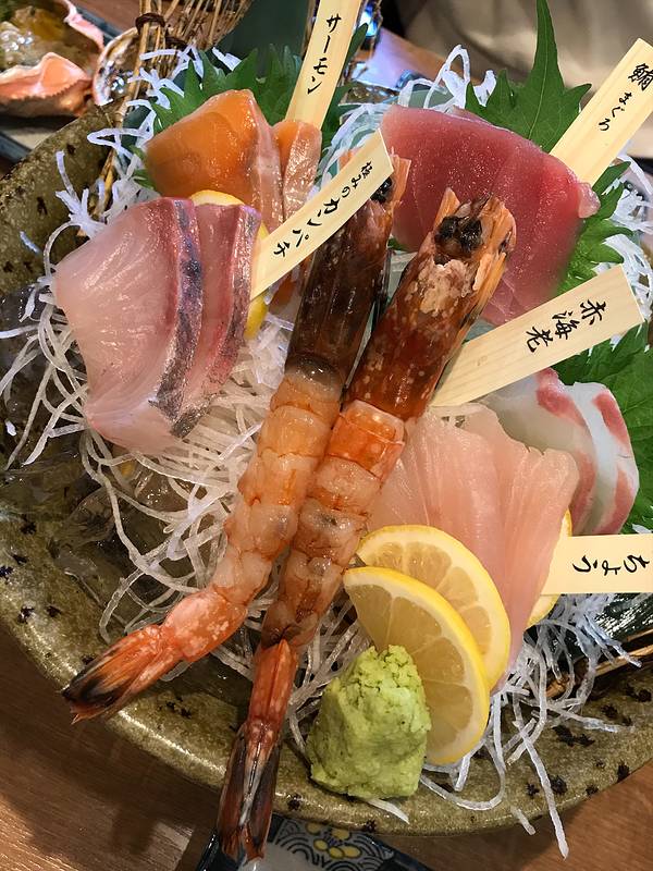 我们选了黑门三平的刺身吃吃看。刺身拼盘里有甜虾、鯖鱼、金枪鱼中腹、三文鱼、扇贝还有海胆。