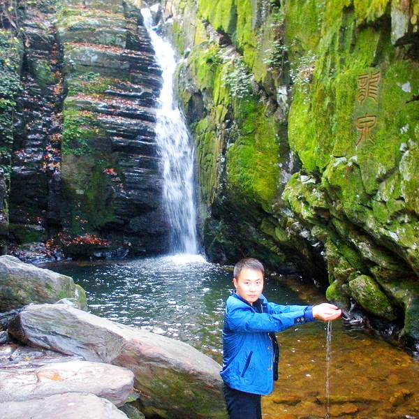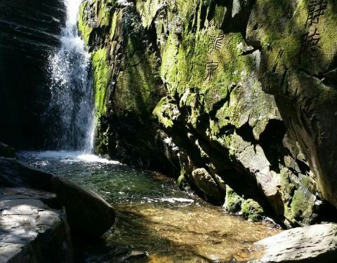 黄龙潭瀑布以秀、幽见长,潭边瀑下之石块崖壁上,青苔遍布,把小涧打扮得一片绿色,衬托着飞流而下的...黄龙潭瀑布以秀、幽见长,潭边瀑下之石块崖壁上,青苔遍布,把小涧打扮得一片绿色,衬托着飞流而下的雪白透明的瀑布,另外,黄龙潭瀑布旁边还有一些石刻。