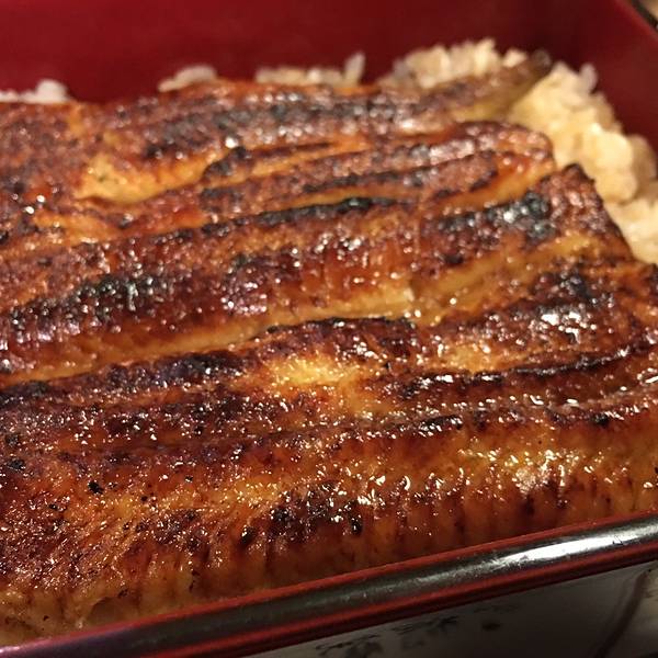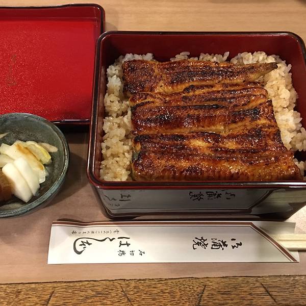 这家鳗鱼饭在江户川橋站——叫橋本,从车站步行大概3-5分钟,不仔细看可能会忽略这家店。店面不是很起眼,店里装修也很简单,但这并不能抵挡住吃货的脚步。周末的早上醒来,就开始想中午吃什么呢?因为没有事先预约,所以报着试试看的心态,去了这家鳗鱼饭。中午11点开始营业,正好还有一桌空位子,其他都已经被预约了,所以还是很火爆的,想吃的朋友尽量提前预约一下。店内装修很简单,座位不算太多,但是很干净整洁。鳗鱼饭一上来,放在日式漆器盒子里,加上一小碟腌渍的萝卜,白菜,甜菜,看上去并没有什么特别的。打开盖子,香味就扑面而来了,烤好的鳗鱼盖在饭上,鱼肉的汁混合着酱汁的味道浸入米饭中,看着就忍不住拿起筷子吃起来,一块鱼肉配一口饭。鱼肉入味,碳烤处香脆,淡淡炭火味,肉质很嫩,并没有被烤干,鳗鱼的皮,有种肥肥滑滑的口感,几乎没有骨头,饭量不算很多,但是我吃饱啦