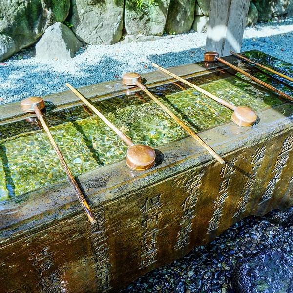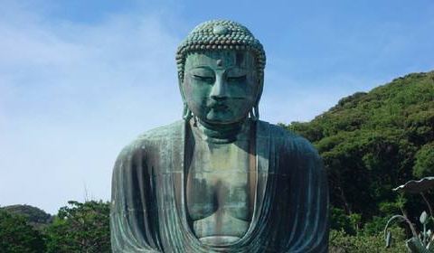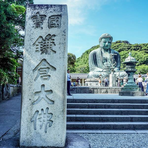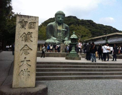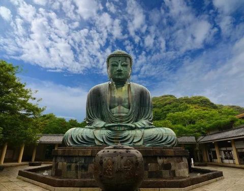 镰仓大佛是高德院中的一座佛像,也是古老镰仓的一大象征,被指定为日本国宝。这座铜像的历史可以追溯到1252年的镰仓时代,大佛高约11.3米,重达121吨,在日本仅次于奈良东大寺的青铜大佛。 由南面的仁王门进入镰仓大佛,然后在手水舍洗个手,再步入中央的院落,映入眼帘的便是巨大的镰仓大佛了。这座阿弥陀如来佛端坐在高台上,其面相和姿势都具有镰仓时代流行的中国宋代佛像风格。若是在樱花季到此,蓝天白云之下的镰仓大佛更别有一番韵味。 镰仓大佛开始是木制的,因暴风雨袭击倒塌,后来重新以青铜铸造,据说当时其全身还涂满了金箔,并供奉在大佛殿中。由于室町时代的一次海啸吞噬了大佛殿,从此镰仓大佛便单独坐落在露天台座上了。 在以大佛为中心的回廊周围可以看到一些与镰仓大佛相关的各种石碑,其中有一块歌碑上还刻着“释迦牟尼是美男”的句子。在面向大佛右侧的回廊内部,悬挂着一双约1米长的大草鞋,据说是茨城县的孩童们编织献给大佛的供物。 继续向后山走去,可以从高处以不同角度俯拍大佛。那里还有一座供奉着观音菩萨的观月堂。 此外,镰仓大佛离长谷寺只有分钟的步行路程,可以顺路游览。
