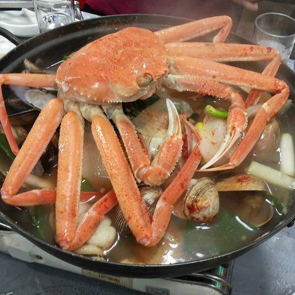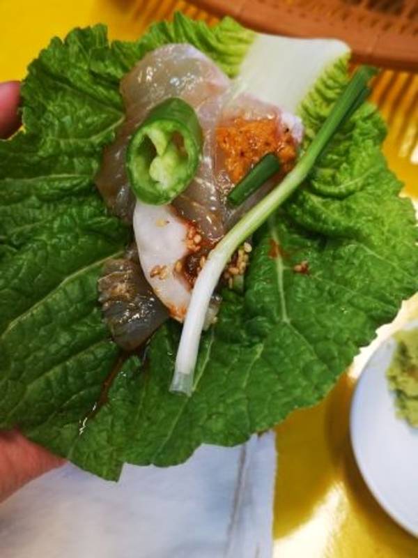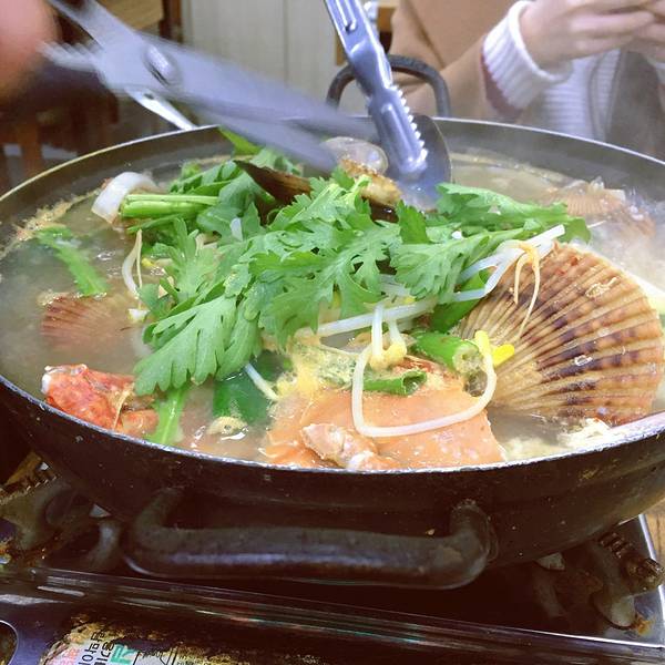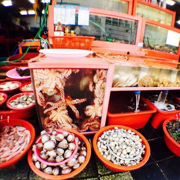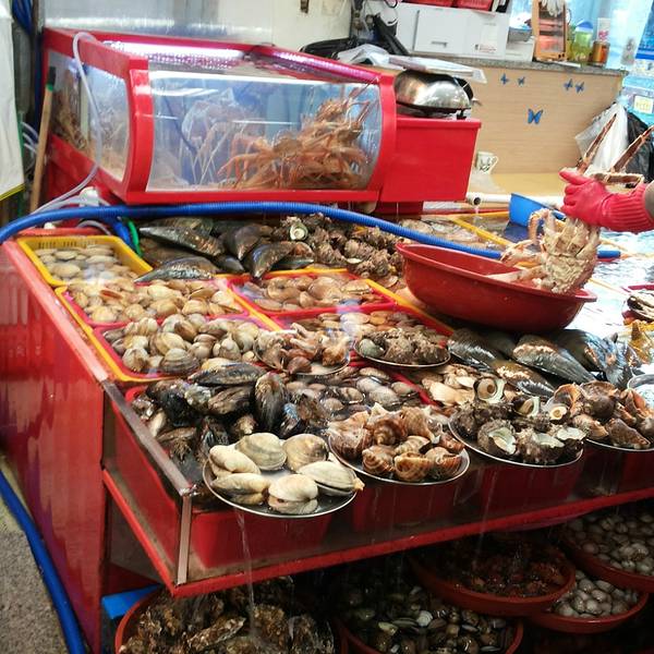 我们当时去语言不通,就在一楼逛了一圈,好不容易发现了一家靠门边的店家老板娘会普通话。所以还是不用担心的,里面有人会将国语。老板娘还特别好心给你想不同的菜系。还会带你去二楼的餐厅,帮你做翻译。【此处小建议】建议在同一家店铺买主要的海鲜,因为卖家会根据你买东西的多少给你减价或者送一些海鲜,我们就送了一大摞小贝壳,后来的贝壳汤就非常鲜。这个推荐,蟹和贝壳一起熬汤,汤汁超级鲜!我是特别喜欢这道菜。这个八爪鱼推荐五颗星,虽然是活的在动来动去,也非常考验你的筷子功力,但是超级鲜甜。【温馨提示】记得咬碎了再吞哦,不然听说会粘住你的食道。鱼片可以吃到鲜味,像包烤肉的吃法,值得一试,但是不会特别推荐,也许是不够冰的缘故,总觉得广东吃过的鱼比较爽口。 展开