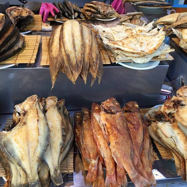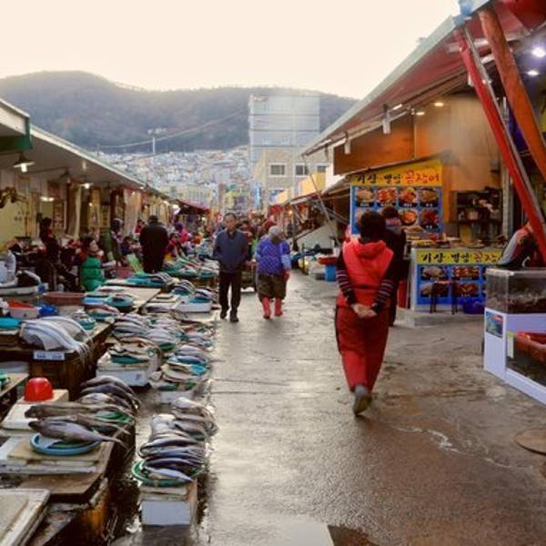 从甘川洞文化村坐公车大约15分钟可以到札嘎其市场,强烈建议体验一下在这么陡的坡上坐车的感觉!札嘎其市场是釜山最大也最古老的水产市场,可以买回去自己烹饪。