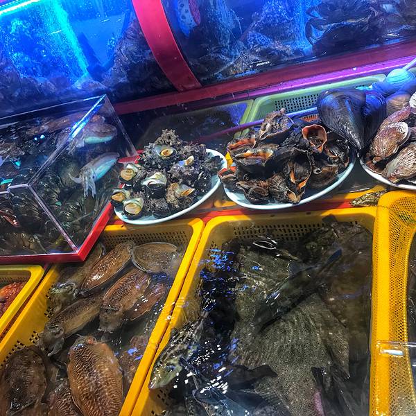 这个市场跟传统的有点不一样,这个札嘎其市场是一栋大楼,一楼是传统的市场,都是不同的商家卖海鲜的,环境算不上干净,卖家也相当有秩序,会尽量保持自己档口的卫生。二楼是不同的加工的餐厅,每个餐厅就是自己圈了点位置,没家的用餐环境不大,也比较简陋,但是胜在干净卫生,店家服务态度非常好,吃了很多她们的餐前小吃都没有说不愿意给我们加。