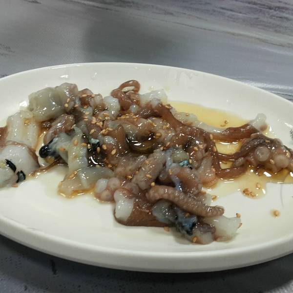 我们把吃活章鱼的地点选在了札嘎其市场,这里是韩国最大的水产市场。一楼为开放式渔市场,共有超过300间海鲜店;二楼则为餐厅,可以品尝最新鲜的海鲜。我们在物色餐厅看菜单时,路过一家餐厅叫渡边屋,招呼我们的阿姨是哈尔滨人,所以交流非常顺畅。阿姨告诉我们,现在所有餐厅的菜单都是上头统一发的,所以没有差别。既然如此,我们就选定了这家。坐下的第一件事,就是询问有没有活章鱼,阿姨说有啊,很好吃。我们看了看菜单上小份是2w韩币,我们只想尝尝鲜,阿姨答应我们,可以给我们上1w的份量。