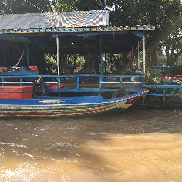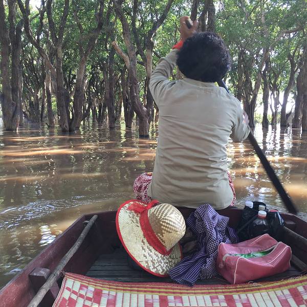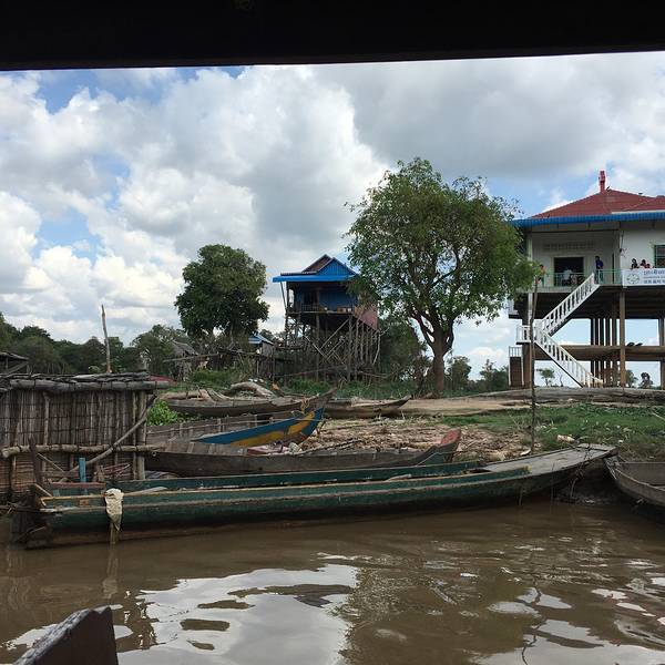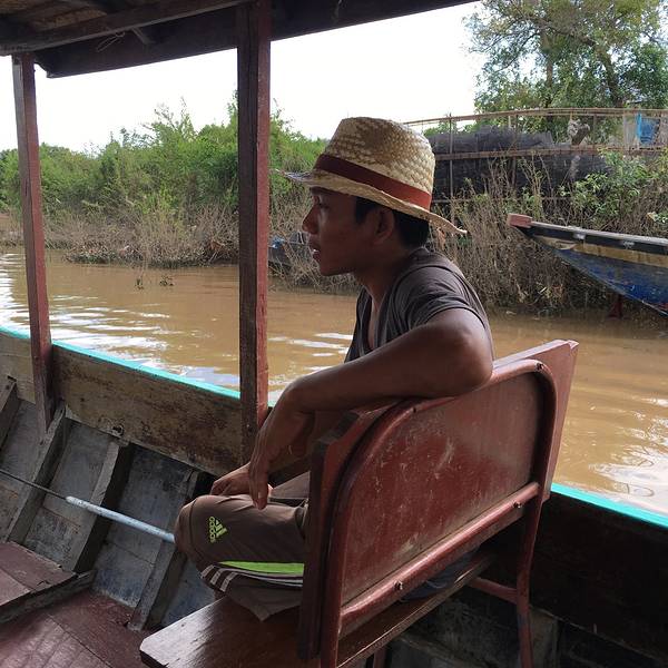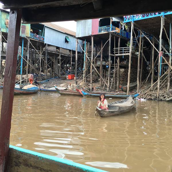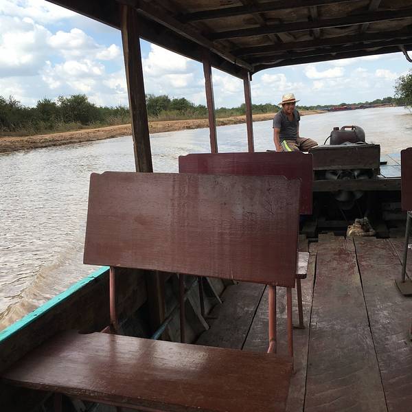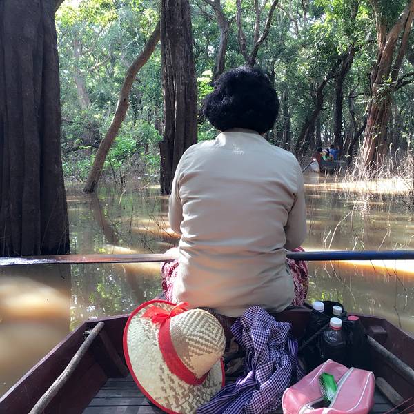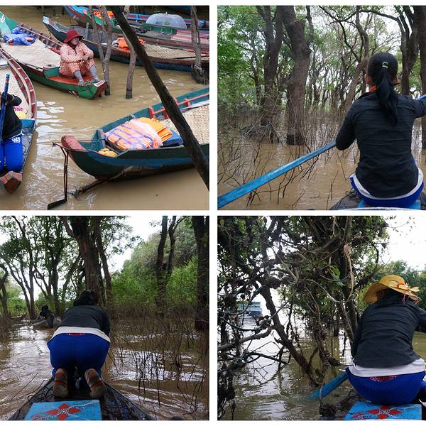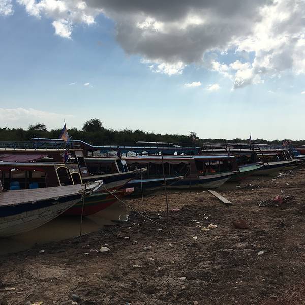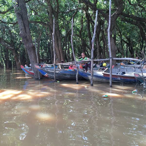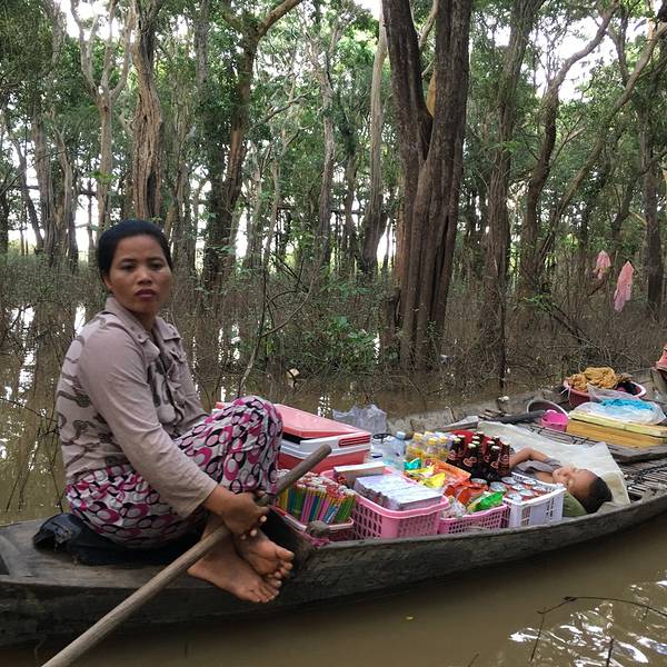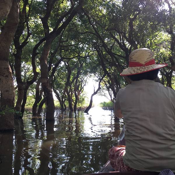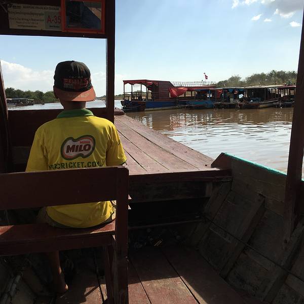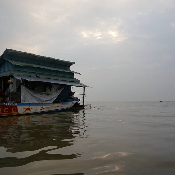 跟着我们的船夫走了很长一段泥路,终于看到了我们的船。小船大概可以坐10来人,我们四个算是包船了。船夫大概也就二十来岁,还带着一个不到十岁的小男孩,小男孩已经会像模像样的开船了。小船在一条河道里开了许久,讲真这里的水实在太脏了。开了十几分钟分钟左右,终于看到浮村了。之前在娘水看浮村印象很深刻,相比之下,这里的村落更有生活气息,说白了就是更杂乱。船夫说住在岸上高脚楼里的人都比较富的人,而有一部分人更穷,就只能住在船上。然而仔细看看两岸的房子,很多都简陋不堪。这个浮村并不大,而且全程也并不会靠岸让人近距离参观所以十来分钟就过去了。过了浮村终于视线开阔起来,船夫熄了火,让船在湖水漂了一会儿。 马上有卖东西的阿姨划船上来兜售吃的喝的。大概3点多,船在一个码头(准确的说是一艘停泊着的大船)靠岸,可以在这个码头换小船去小树林,一个人好像也是10刀还是15刀。也可也在码头的餐厅里吃饭休息.我们因为没有好好做功课并不知道我们的游船时间只有2个多小时,所以起初打算在码头晃一下,然后等4点多去小树林里看日落,结果船夫告诉我们,我们必须4点前返航 无奈,我们只能提前去买了小船的船票上船了。