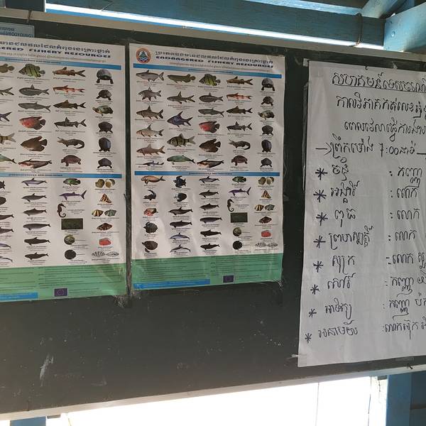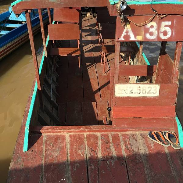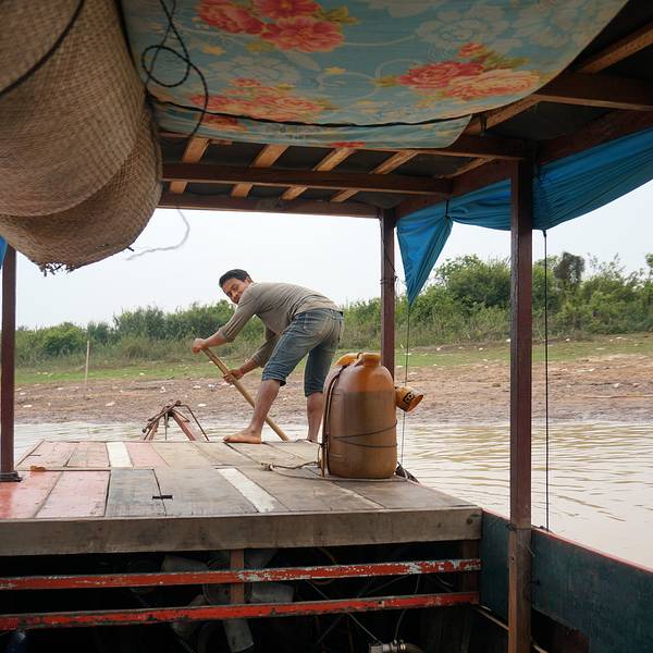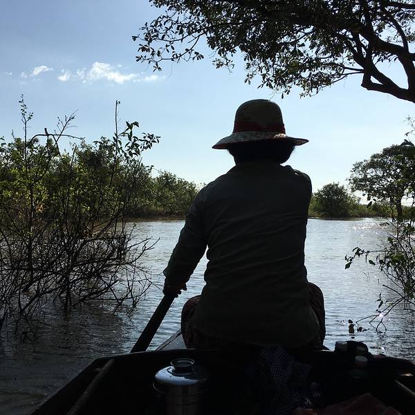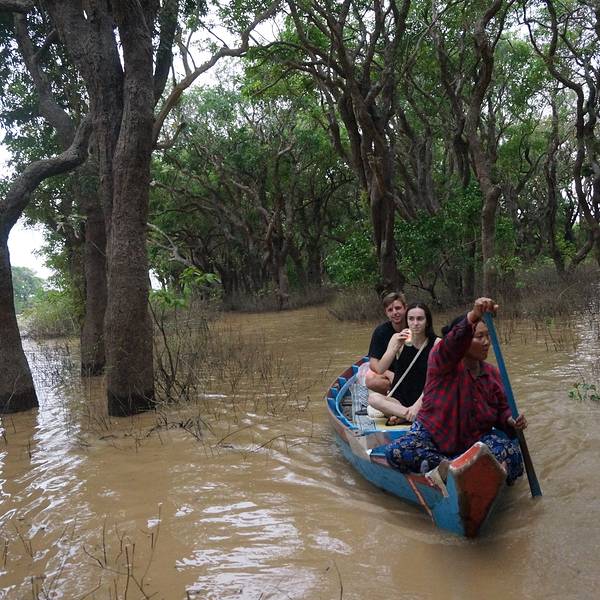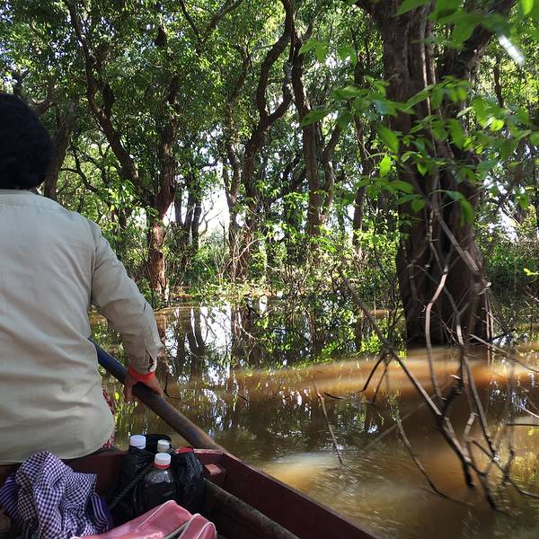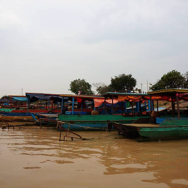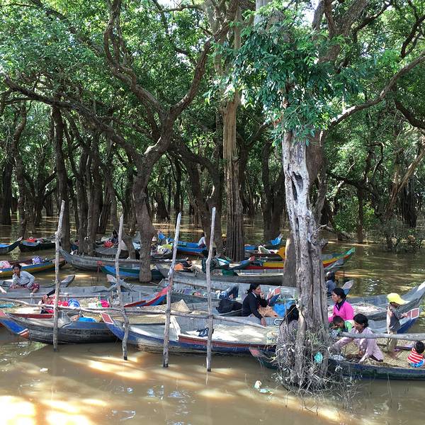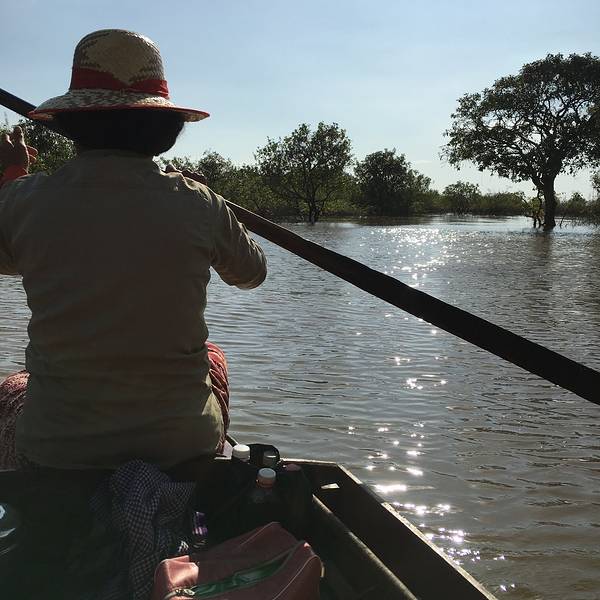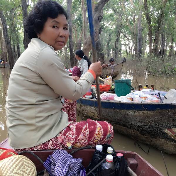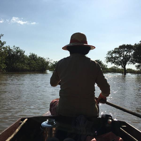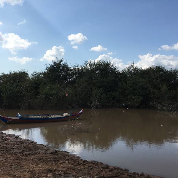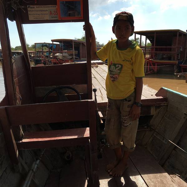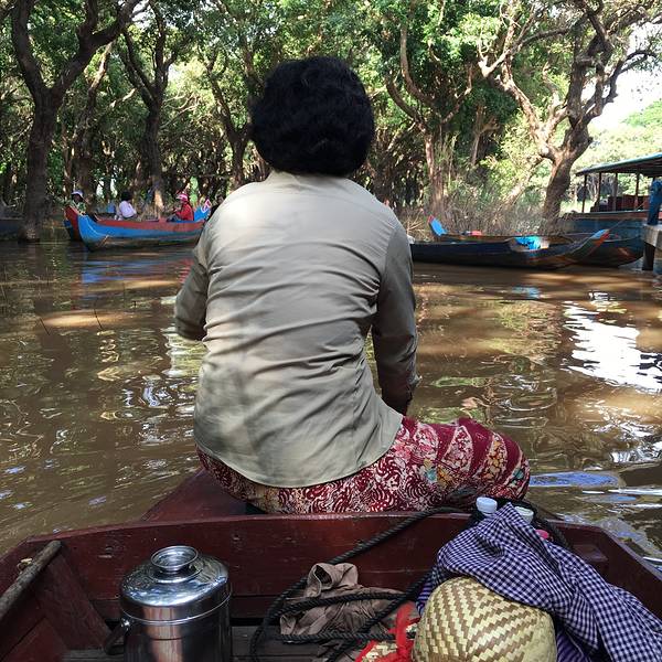 跟着我们的船夫走了很长一段泥路,终于看到了我们的船。小船大概可以坐10来人,我们四个算是包船了。船夫大概也就二十来岁,还带着一个不到十岁的小男孩,小男孩已经会像模像样的开船了。小船在一条河道里开了许久,讲真这里的水实在太脏了。开了十几分钟分钟左右,终于看到浮村了。之前在娘水看浮村印象很深刻,相比之下,这里的村落更有生活气息,说白了就是更杂乱。船夫说住在岸上高脚楼里的人都比较富的人,而有一部分人更穷,就只能住在船上。然而仔细看看两岸的房子,很多都简陋不堪。这个浮村并不大,而且全程也并不会靠岸让人近距离参观所以十来分钟就过去了。过了浮村终于视线开阔起来,船夫熄了火,让船在湖水漂了一会儿。 马上有卖东西的阿姨划船上来兜售吃的喝的。大概3点多,船在一个码头(准确的说是一艘停泊着的大船)靠岸,可以在这个码头换小船去小树林,一个人好像也是10刀还是15刀。也可也在码头的餐厅里吃饭休息.我们因为没有好好做功课并不知道我们的游船时间只有2个多小时,所以起初打算在码头晃一下,然后等4点多去小树林里看日落,结果船夫告诉我们,我们必须4点前返航 无奈,我们只能提前去买了小船的船票上船了。