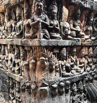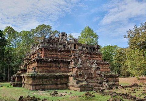 空中宫殿原名金角山,位于通王城内,在巴戎寺的西北边,是吴哥王宫中的一座神庙,之前是湿婆庙,后来被改建成须弥山式的印度教寺庙。它是当时通王城中较高的建筑,也是如今王宫里仅存的较为完整的建筑,站在上面视野很好,会给人一种置身于空中的感觉。从巴戎寺往北走,来到战象台阶,再往西走不远就可以看到空中宫殿。它由三层长方形的须弥台构成,层层叠高,像是一座金字塔,每层须弥台的四角还装饰着狮子或大象的雕像。在这座须弥山四边的正中各有一条陡峭的台阶连通着顶层,要爬上去还得手脚并用,吃一番力才行。有一面台阶上搭建了木质阶梯,方便游客攀爬。
