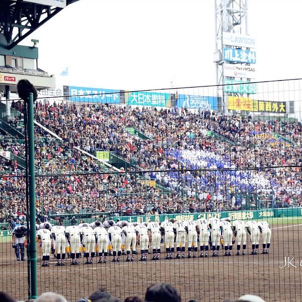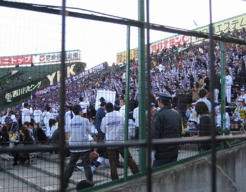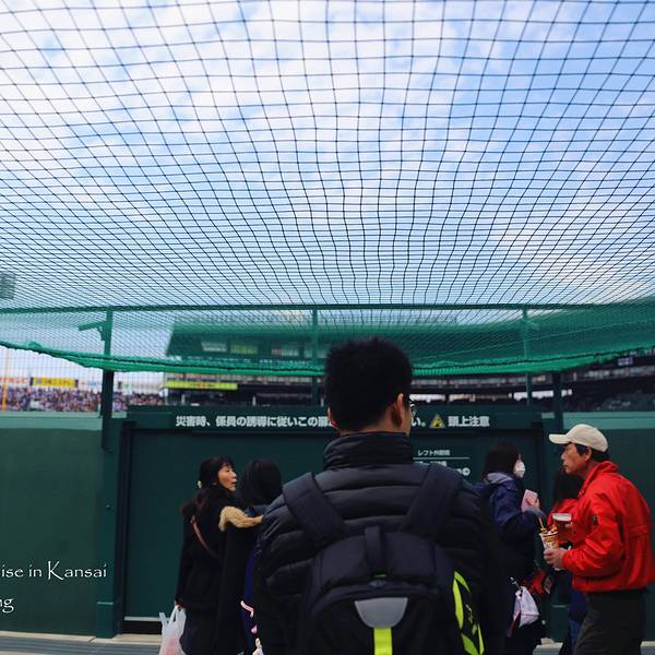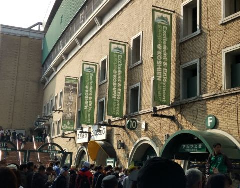 今天刚好是高校棒球春季的选拔赛的半决赛,上午有两场比赛,我们去到的时候第一场球赛已经开始了。一队小学棒球队一起来看比赛,棒球在日本就是一项如此热门的运动。买了两张一垒席的球票,准备去感受一下日本高校棒球的热情!这个球票是一个全日票,你可以在里面看一天的球,但是进去了就不能出来,一旦出来票就失效了。球场里面设施很齐全,非常多吃的喝的,当然价格也比外面要贵。我们在一垒席找好位置坐下,这是棒球刚刚进行到第三局,正是大家都进入状态的时候。日本每年都会在各区进行比赛选拔,只有最强的队伍才能脱颖而出进入甲子园比赛,难怪说甲子园是每个棒球学生的梦想呢。怎么说呢,作为日本高校棒球,居然能在这么有名的球场上打比赛,而且受到如此多的瞩目,确实很让人振奋,这不仅是一份为校争光的荣誉,也能为自己未来的事业加分。