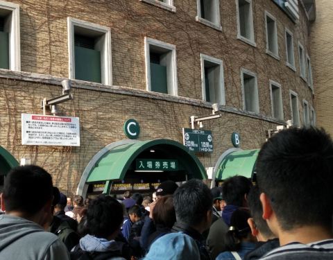 今天的第一站就是阪神甲子园棒球场,从梅田地铁站有阪神电车可以直达甲子园,售票处还有专门为去甲子园设置的往返优惠票。买票的人还挺多的,当时我就窃喜了,看来今天甲子园是有比赛的。甲子园站有专门的球场指引,不过只要跟着人群走,甲子园就在不远处。