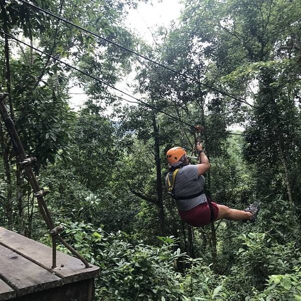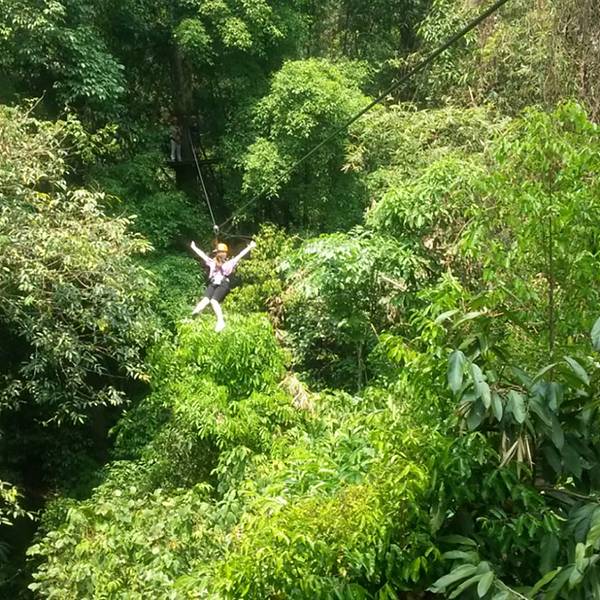 建议:热带雨林蚊虫多 穿长袖长裤运动鞋 必要时出发前喷上防蚊虫喷雾帽子太多人带过了 味道有点重 所以还是得带上浴帽一开始超害怕 但是适应了超爽的~就想一只只猴子,穿梭在丛林里。除了速降,其他我都觉得ok,这是速降实在太可怕了遇到了来自美国的一家人 妈妈带着三个孩子 其中一对是双胞胎,我们用蹩脚英文居然聊得还蛮开心。因为需要六人一组,所以我们就被分配在一个小组。 展开