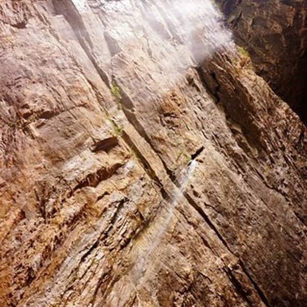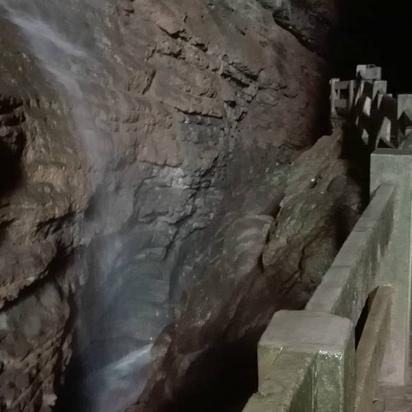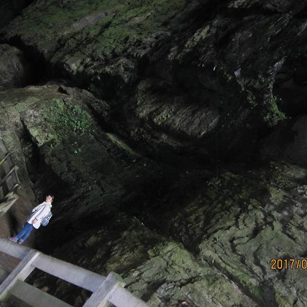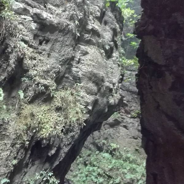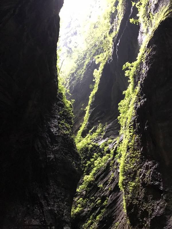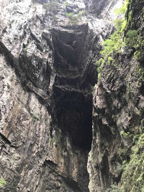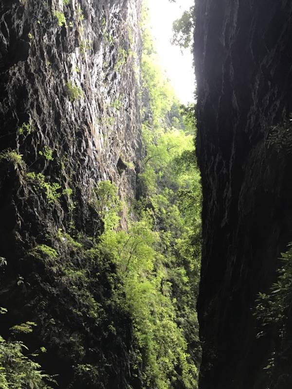 地缝要比天坑更震撼人,我个人感觉。尤其走到很黑的地方的时候真有点走入地缝的感觉,名字起的很贴切。人被夹在两个石壁中间,上面是黑黑的石缝,下面是湍急的水不知流向何处的时候,整个人感觉特别的渺小,好像就要被吞噬了一样。而且在地缝里的时候经常会想起盗墓笔记还有鬼吹灯里描写地下河的情景。从上往下走的时候照的顺着这条路走进去越走越黑,心里越来越紧张,越紧张就越想往里走,不过前后一个人没有,妈妈和女儿也没跟进来。有点遗憾就是没敢一直走到头,后来太黑就不敢走了。