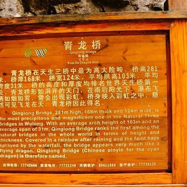 金骆驼 从入口处需要坐电梯到桥下,然后一路行走在峡谷间,如仙境一般。其中,青龙桥是三桥之中垂直落差最大的一座天生三桥,我觉得是作为武隆世界自然遗产的主打部分,也是去武隆最大的亮点和看点了,是亚洲最大的天生桥群。由天龙桥、青龙桥、黑龙桥组成,三座天生石拱桥呈纵向排列,平行横跨在羊水河峡谷上,将两岸山体连在...天生三桥,我觉得是作为武隆世界自然遗产的主打部分,也是去武隆最大的亮点和看点了,是亚洲最大的天生桥群。由天龙桥、青龙桥、黑龙桥组成,三座天生石拱桥呈纵向排列,平行横跨在羊水河峡谷上,将两岸山体连在一起,仅距离百米,实属罕见。其中,青龙桥是三桥之中垂直落差最大的一座。从入口处需要坐电梯到桥下,然后一路行走在峡谷间,如仙境一般。可以用一上午乃至更长的时间一路慢慢走,慢慢品,慢慢看,才能领略其内敛的灵秀之美。自《满城尽带黄金甲》后,《爸爸去哪儿》和《变形金刚4》也将这作为外景地,绝对值得一去。