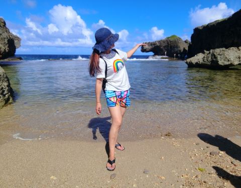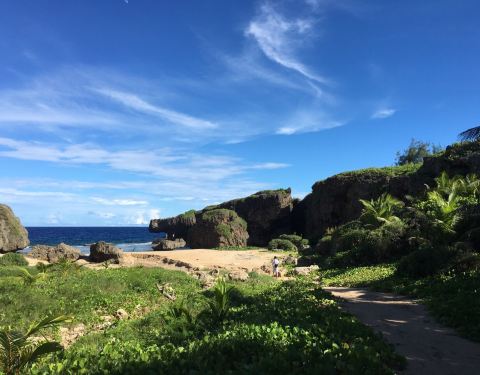 侧脸海滩位于塞班岛东侧,距离鳄鱼头海滩不远,是海岸线上的一个呈凹字形的小缺口。海滩右侧的岩石形似人的侧脸,可在此拍摄一张有趣的借位照。侧脸海滩上没有沙滩,穿过丛林后,脚下是当年火山爆发留下来的黑色砂石。海水倒灌进来,冲刷着这些黑色砂石,使得这些砂石在海水中闪亮亮的。这里由于海水倒灌的原因,因此相对于附近鳄鱼头海滩汹涌的海浪而言,这里的海水非常的平缓。你可以站在两侧岩石的中间赤足戏水,还可以和侧脸鼻尖对鼻尖,也可以握拳摆出打他鼻尖,又或是用手指指着他的鼻尖拍摄有趣的借位照。