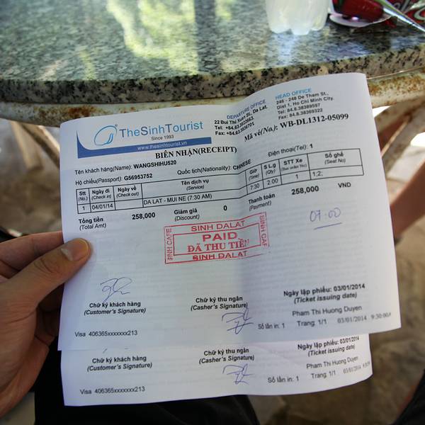 去美奈的巴士票(因为下雨,小雪又生病,我们没再找新咖啡的办公室,直接在旅店前台订了一家不知名的巴士公司的票,事实证明小公司的巴士都挺坑的) 130 VND
