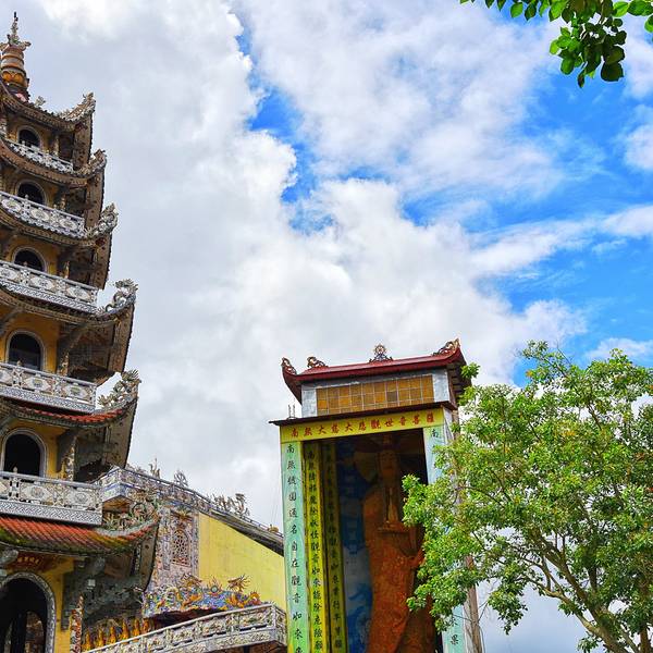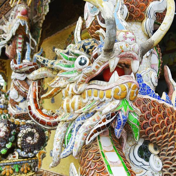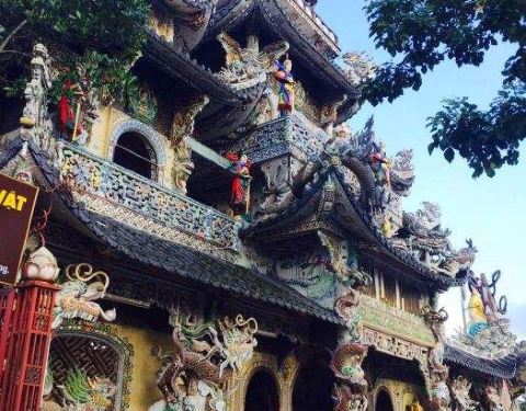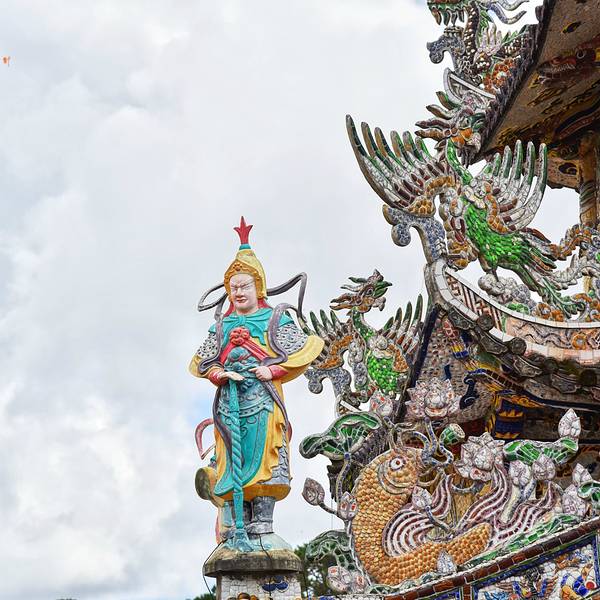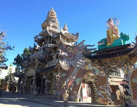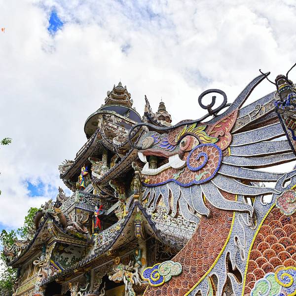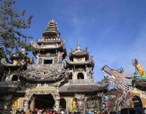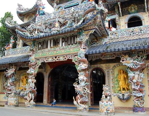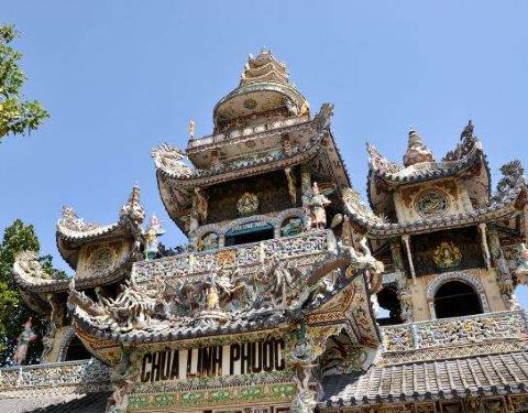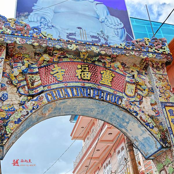 灵福寺(Linh Phuoc Pagoda)寺高约七层,被难以计数的龙造型装饰得鲜艳夺目、典雅瑰丽;寺庙前的龙柱、庙墙上的龙雕、庙窗上的龙饰、庙门楣上方的龙对,都是用彩陶、彩玻璃碎片拼贴、镶嵌而成。寺庙里还有很多中国元素,比如祥云、龙、佛像的样子,甚至还有西游记的人物雕塑。