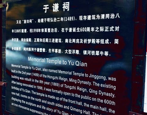 门口走进右手边有一棵小树,上面挂满人们的祝福,可以去许许愿“粉身碎骨浑不怕,要留清白在人间”,这是一股饱含民族气节,大义凛然的清流源泉。白墙灰瓦,朱漆大门,“于忠肃公祠”几个篆书大字显得庄严肃穆。 门口走进右手边有一棵小树,上面挂满人们的祝福,可以...“粉身碎骨浑不怕,要留清白在人间”,这是一股饱含民族气节,大义凛然的清流源泉。白墙灰瓦,朱漆大门,“于忠肃公祠”几个篆书大字显得庄严肃穆。 门口走进右手边有一棵小树,上面挂满人们的祝福,可以去许许愿。然后走进第一个祠堂,内有于谦的雕像及兵器,“万古流芳堂”则以文字的形式展现于谦高尚的品格。祠堂右手边有一个碑亭,出祠堂能够看到一排牌坊,中间甬道,顺着向前是于谦墓。 展开