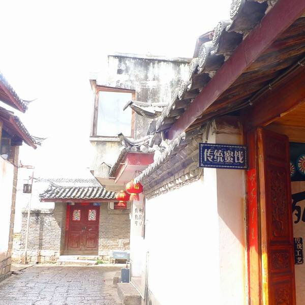在古城内步行沿四方街旁边的大石桥顺水而下走到百岁桥,左手边的巷子就是百岁坊,在45号。