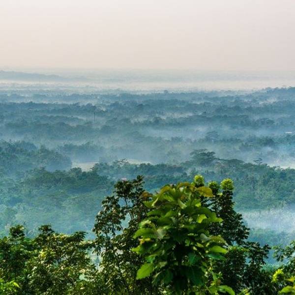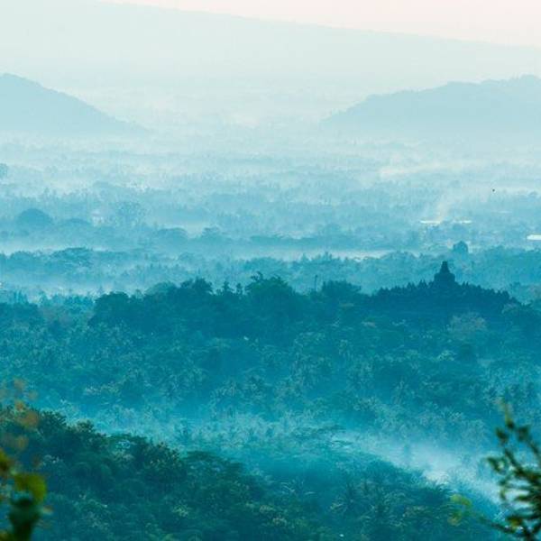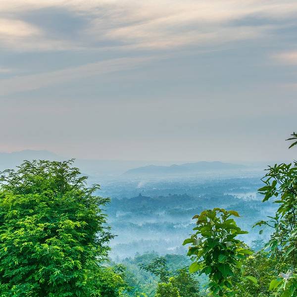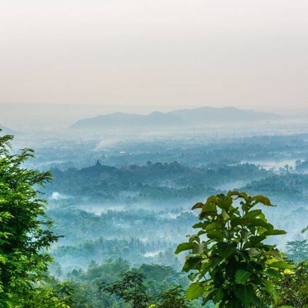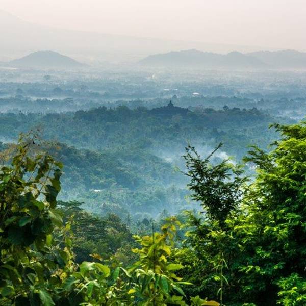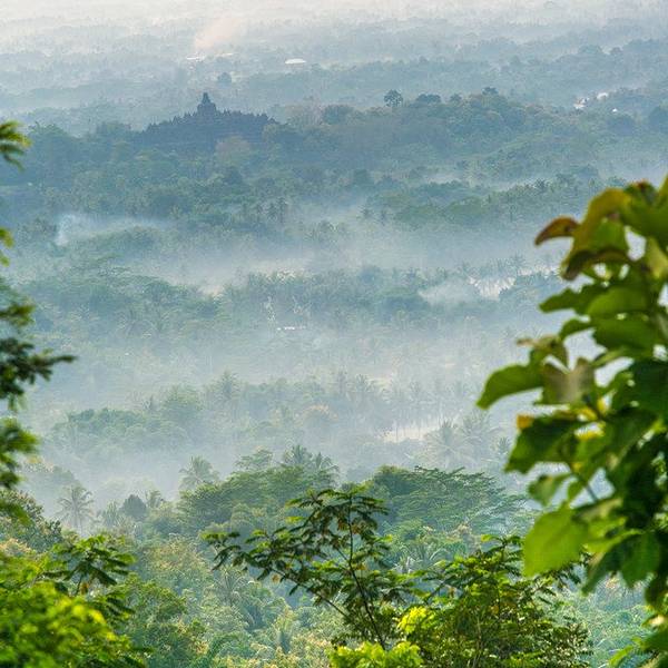转个方向,从观景台可以远眺到掩映在云雾绿茵中的婆罗浮屠佛塔。